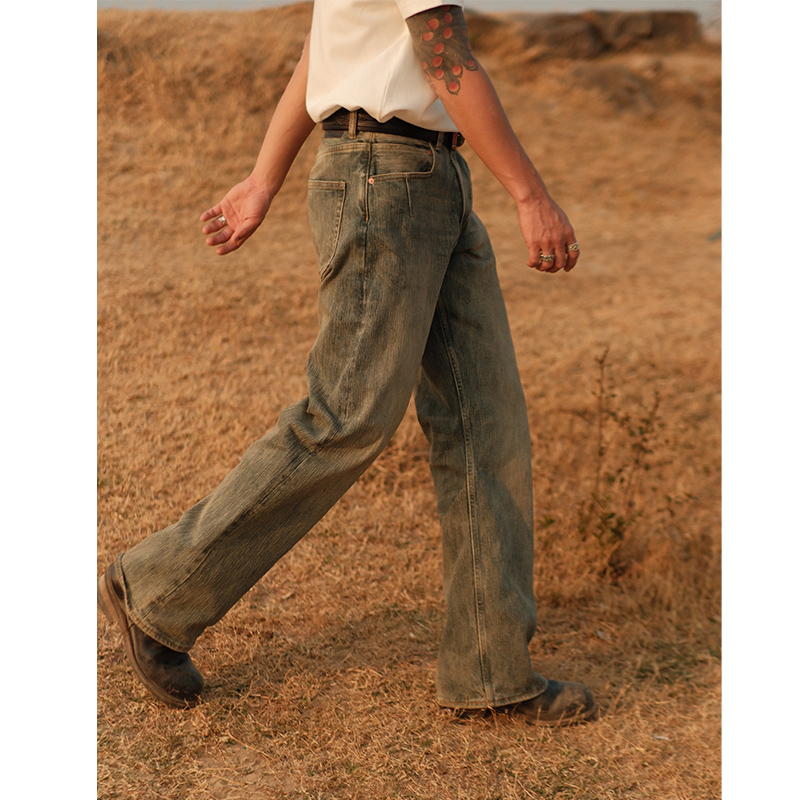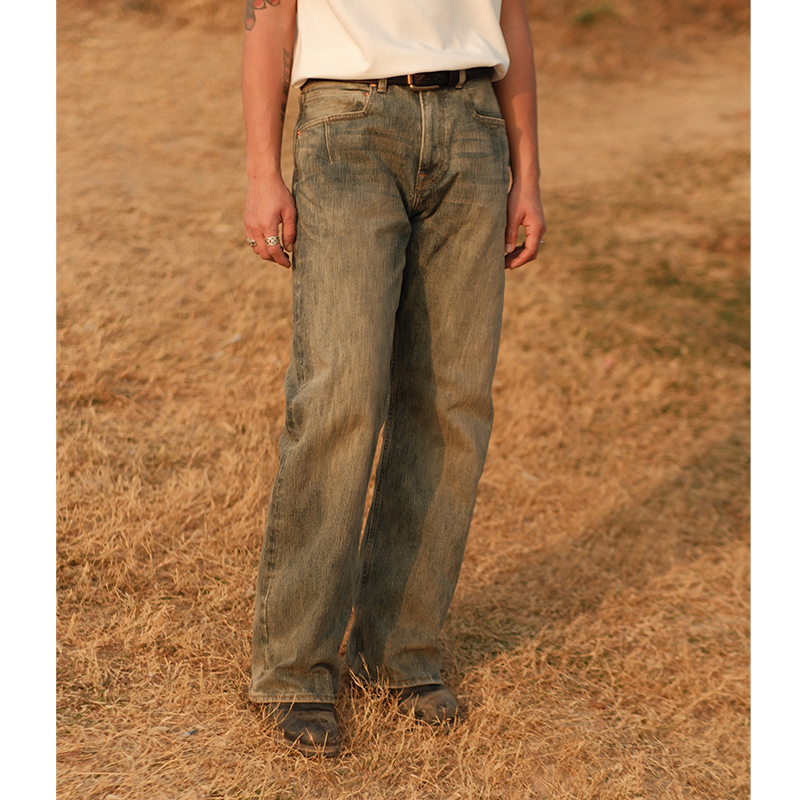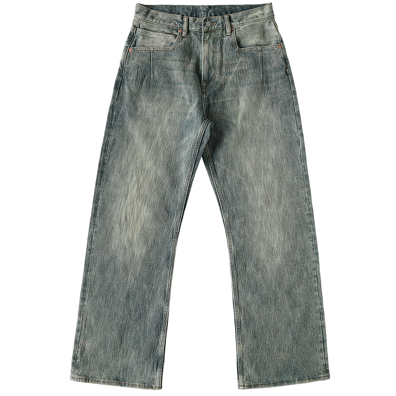 MBBCAR窄幅15.3OZ不规则爆竹节黄泥洗靛蓝高腰阔腿赤耳丹宁牛仔裤