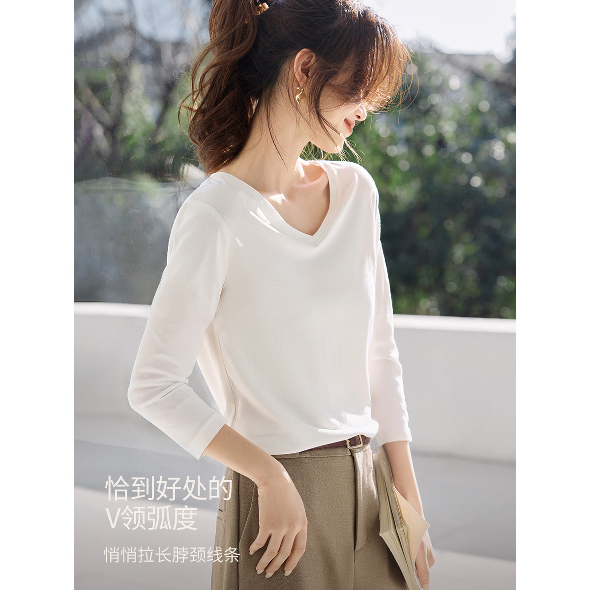 沫晗依美气质担当百搭休闲V领简约经典T恤2026春季新款通勤长袖女