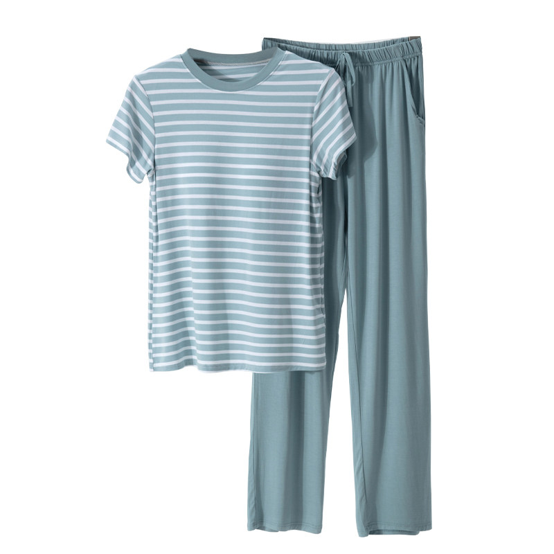 春夏新款女莫代尔带胸垫睡衣短袖长裤宽松家居服套装两件套可外穿
