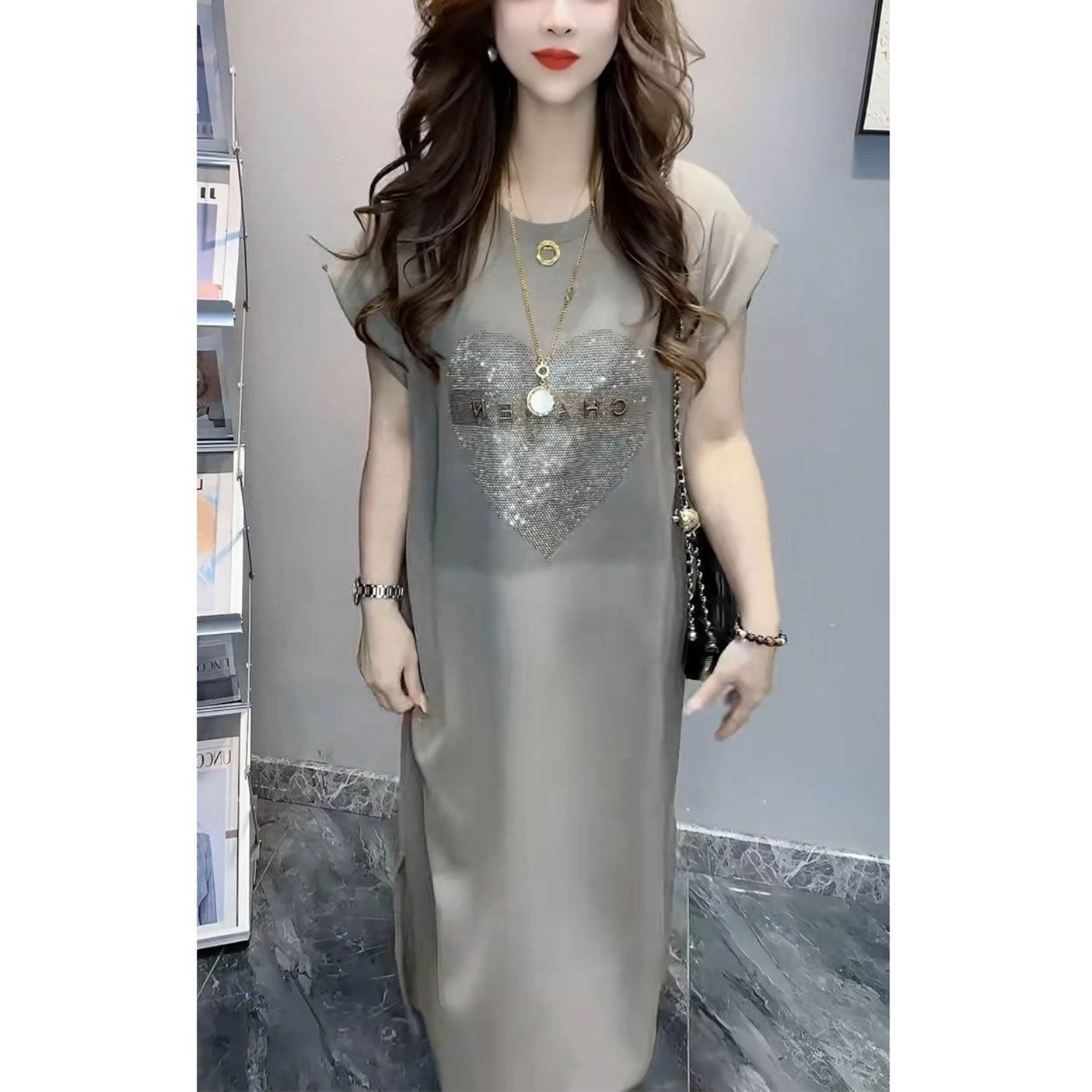 2025夏季新款时尚大码宽松显瘦短袖连衣裙女复古爱心烫钻中长裙子
