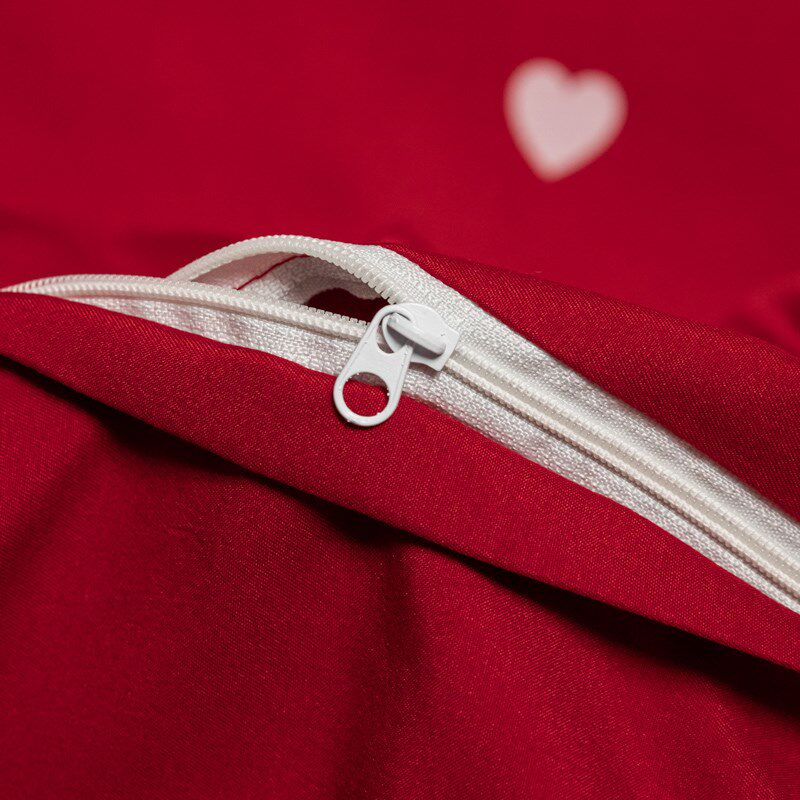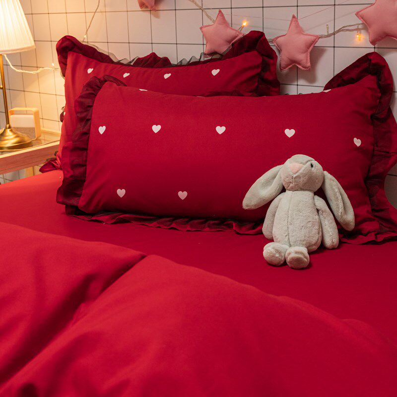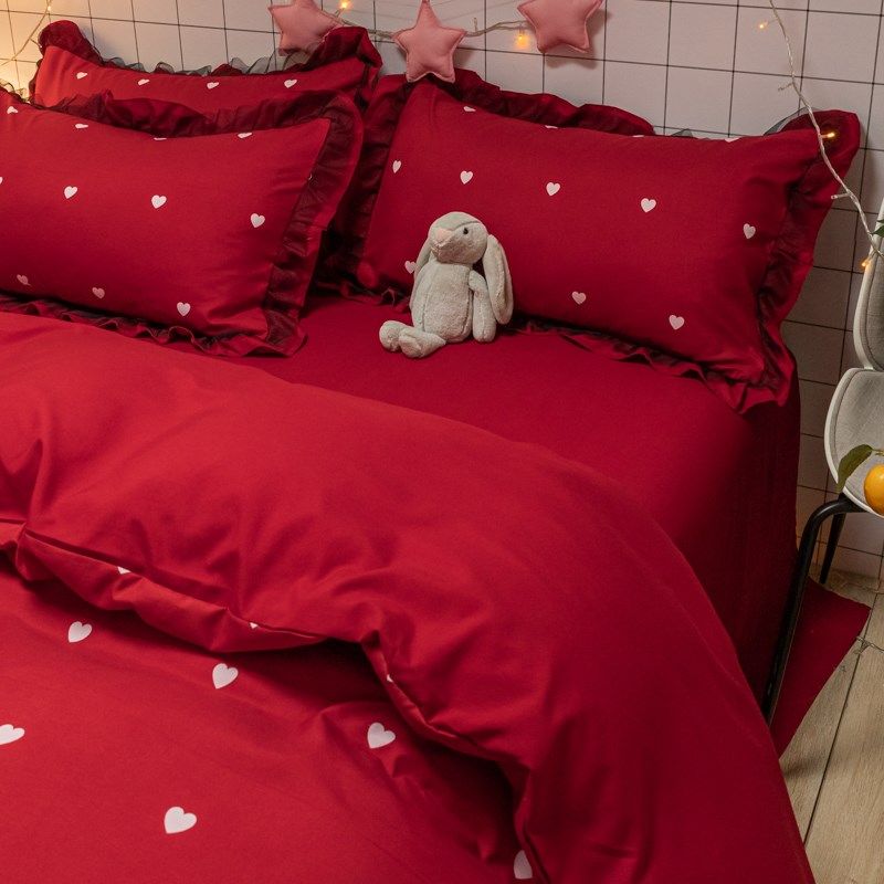 大红色婚庆四件套结婚网红v被套床单水洗棉简约纯色床上新婚被罩