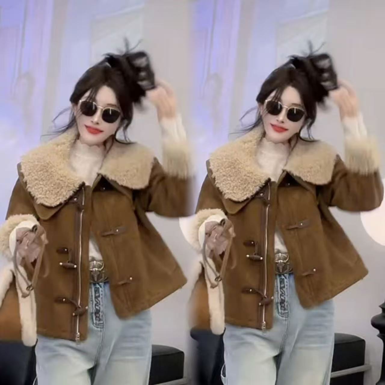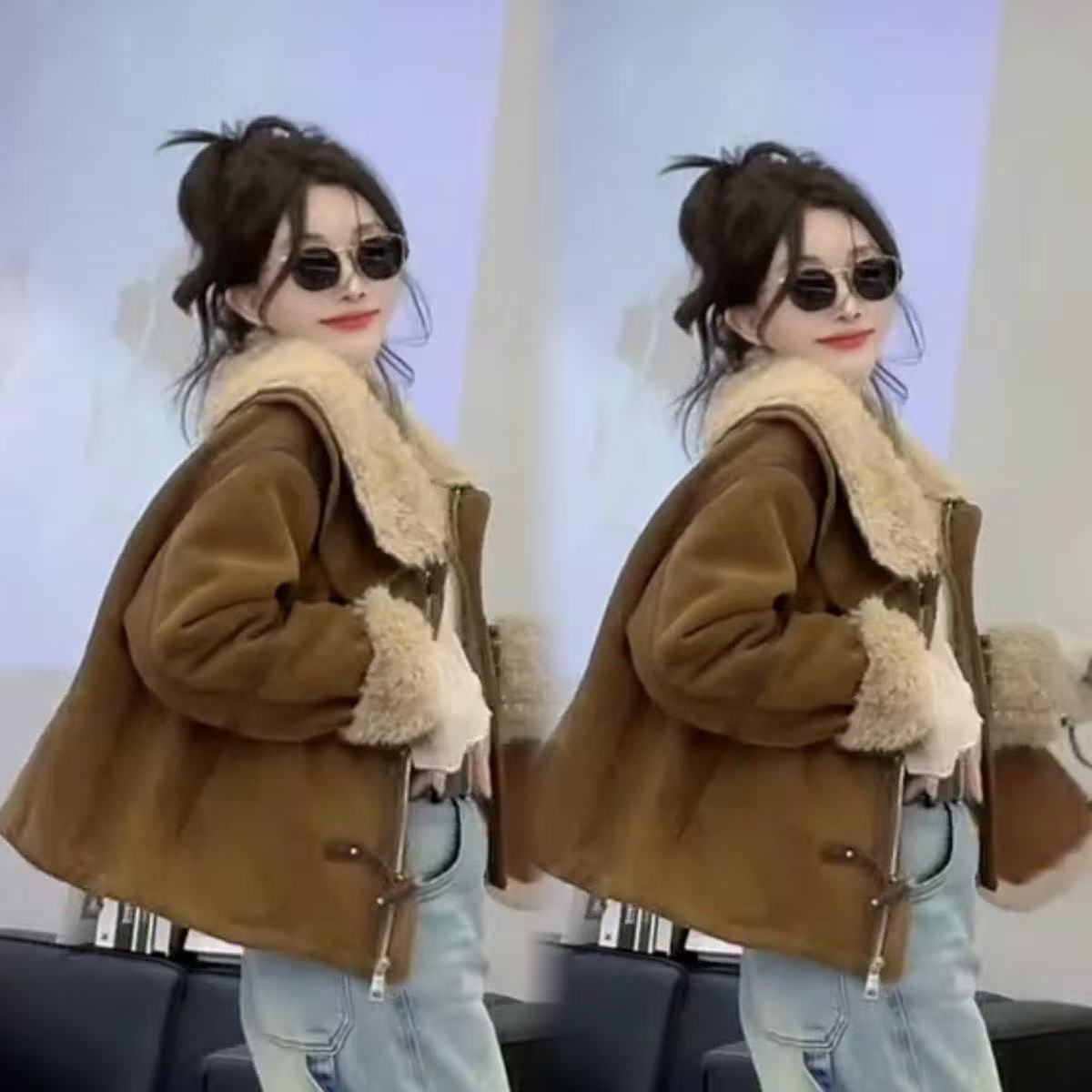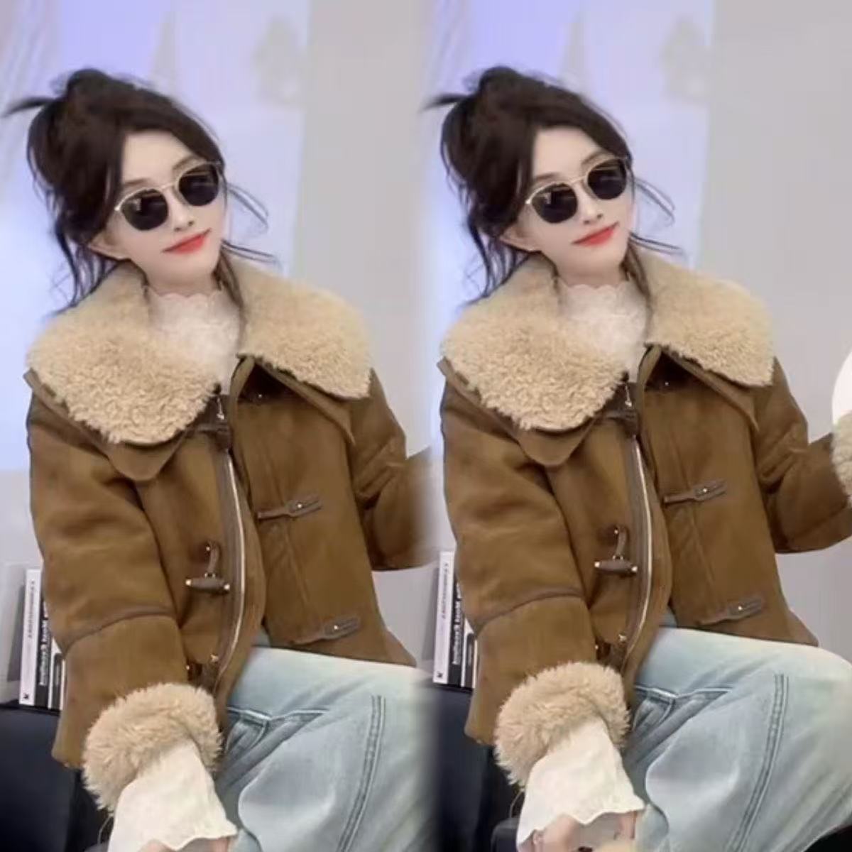大翻领机车服女仿羊羔毛外套女2025冬加绒宽松皮毛一体麂皮绒上衣