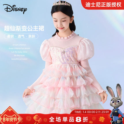 迪士尼女童连衣裙小女孩洋气公主裙女宝针织网纱裙儿童秋冬蛋糕裙