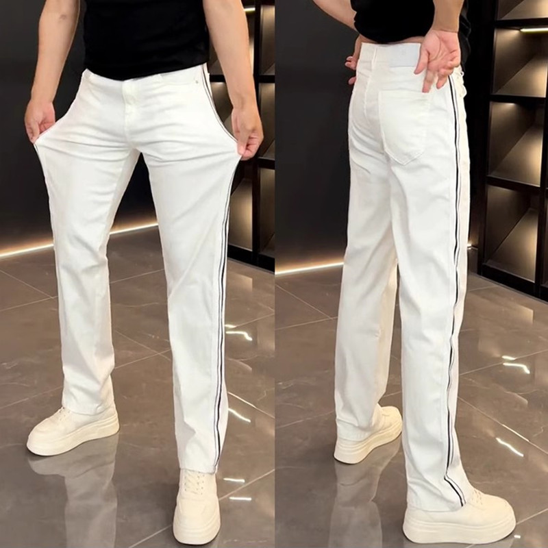 秋季新款欧货牛仔裤男百搭潮牌侧边织带直筒裤青年休闲宽松阔腿裤