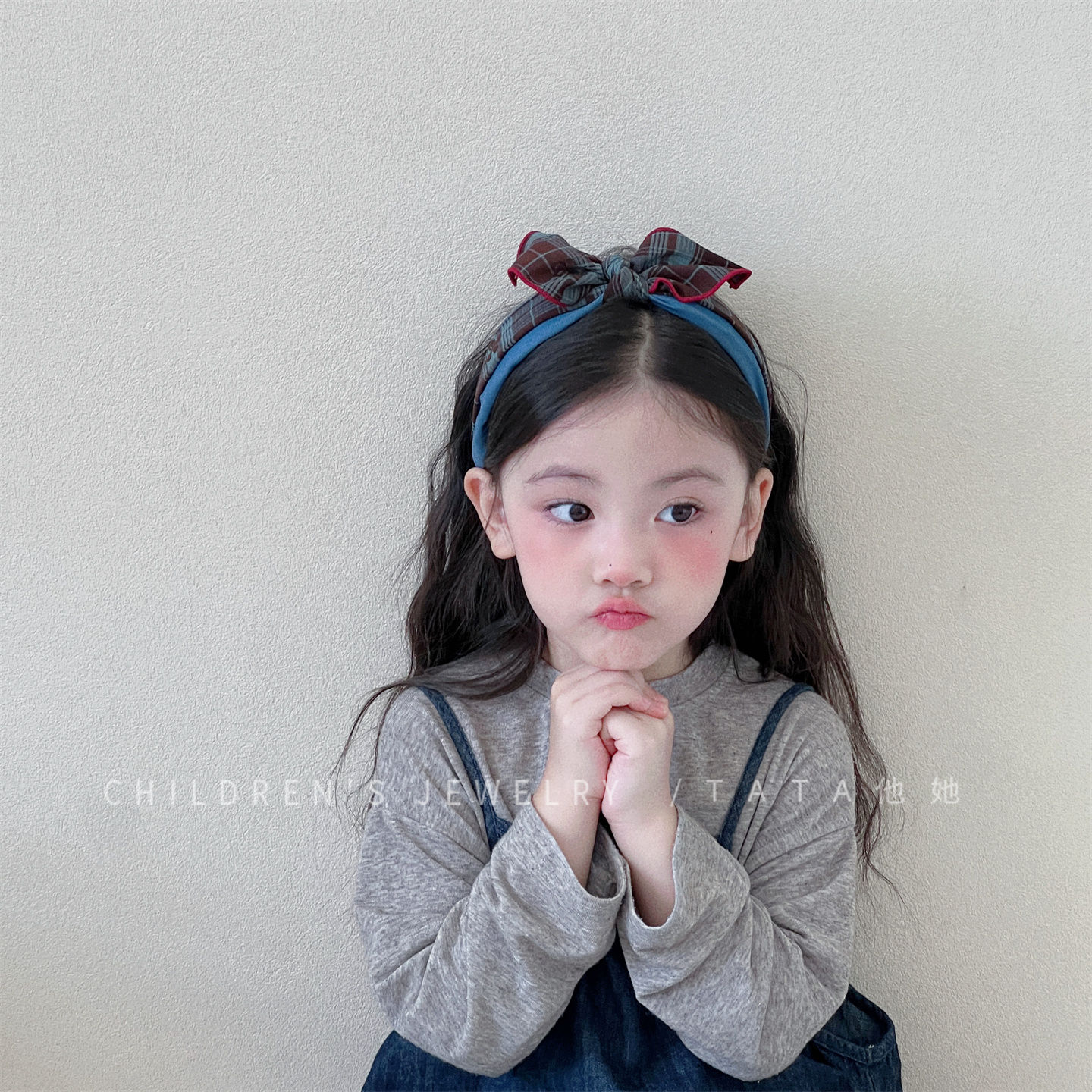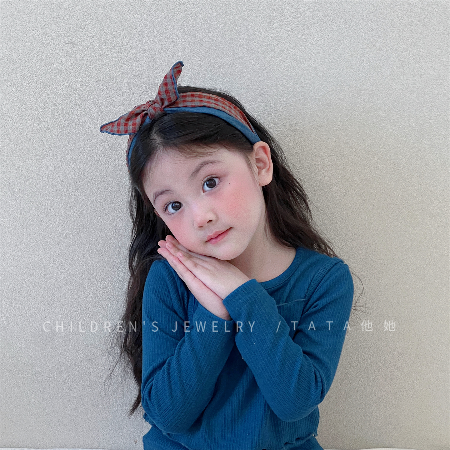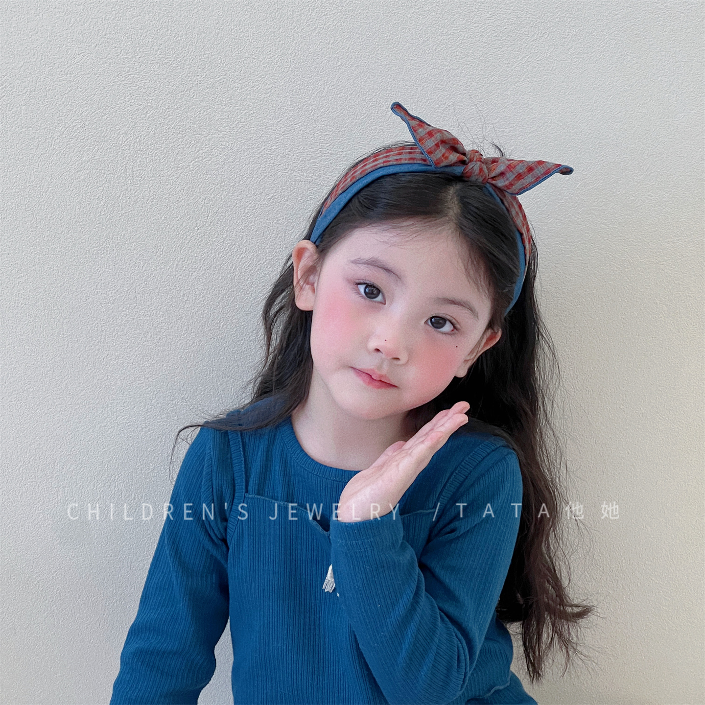 复古格纹宽边打结兔耳朵发箍儿童布艺压发洗脸头箍不勒头防滑头箍