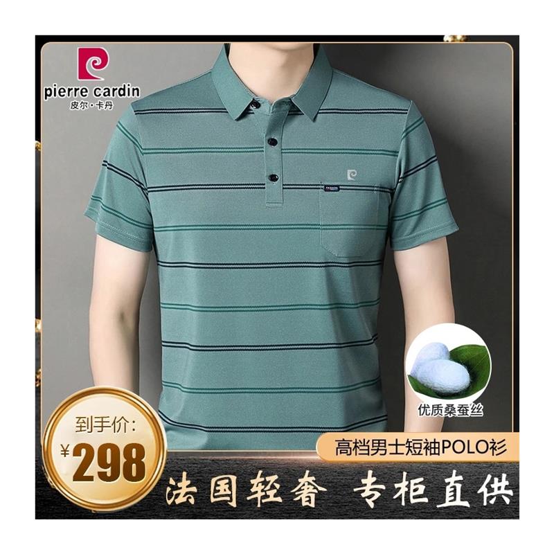 皮尔卡丹桑蚕丝短袖t恤男士夏季中年爸爸装翻领带口袋条纹polo衫