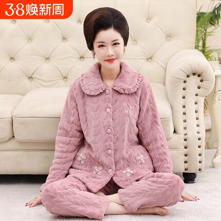 妈妈睡衣女秋冬季珊瑚绒加绒加厚法兰绒冬天大码中老年家居服套装