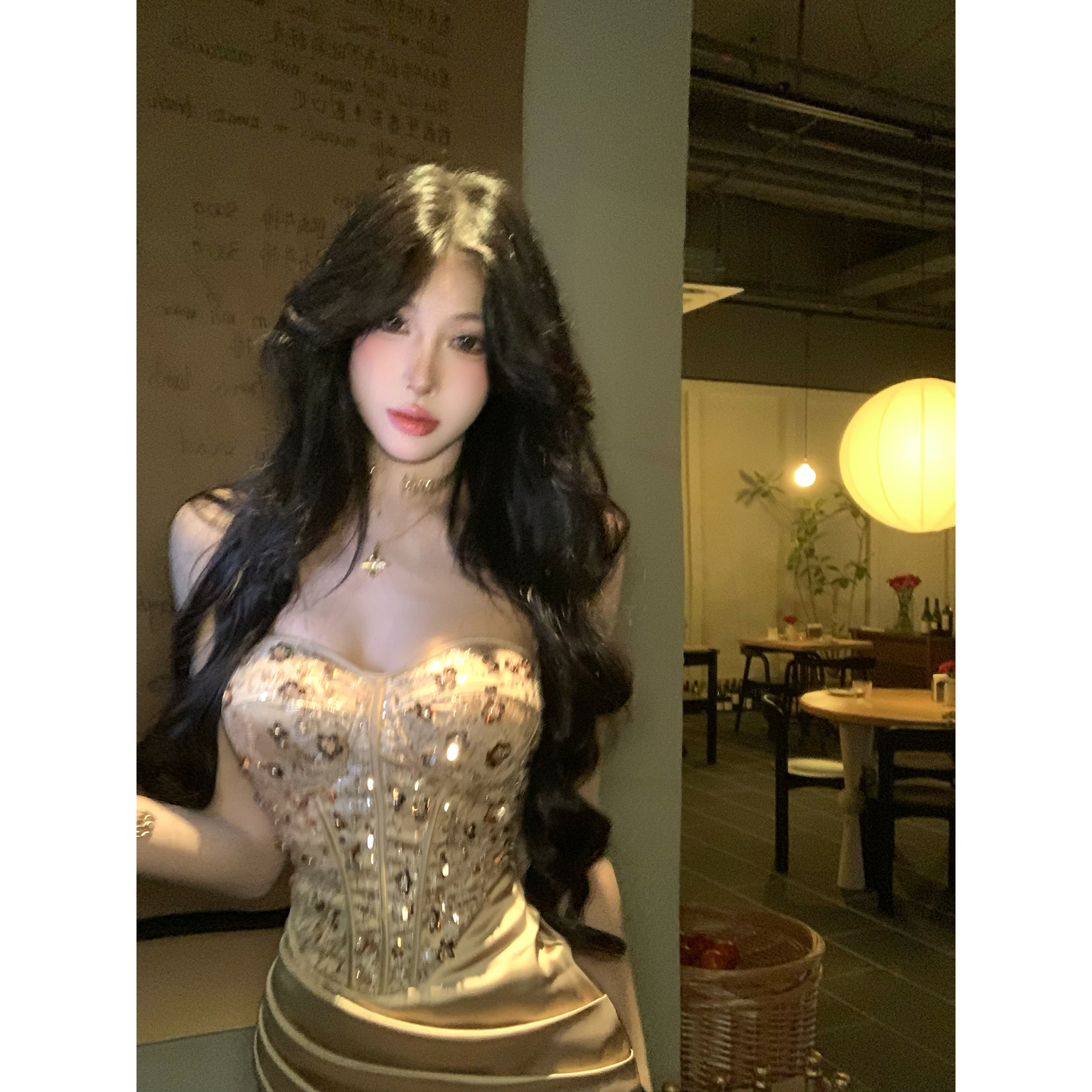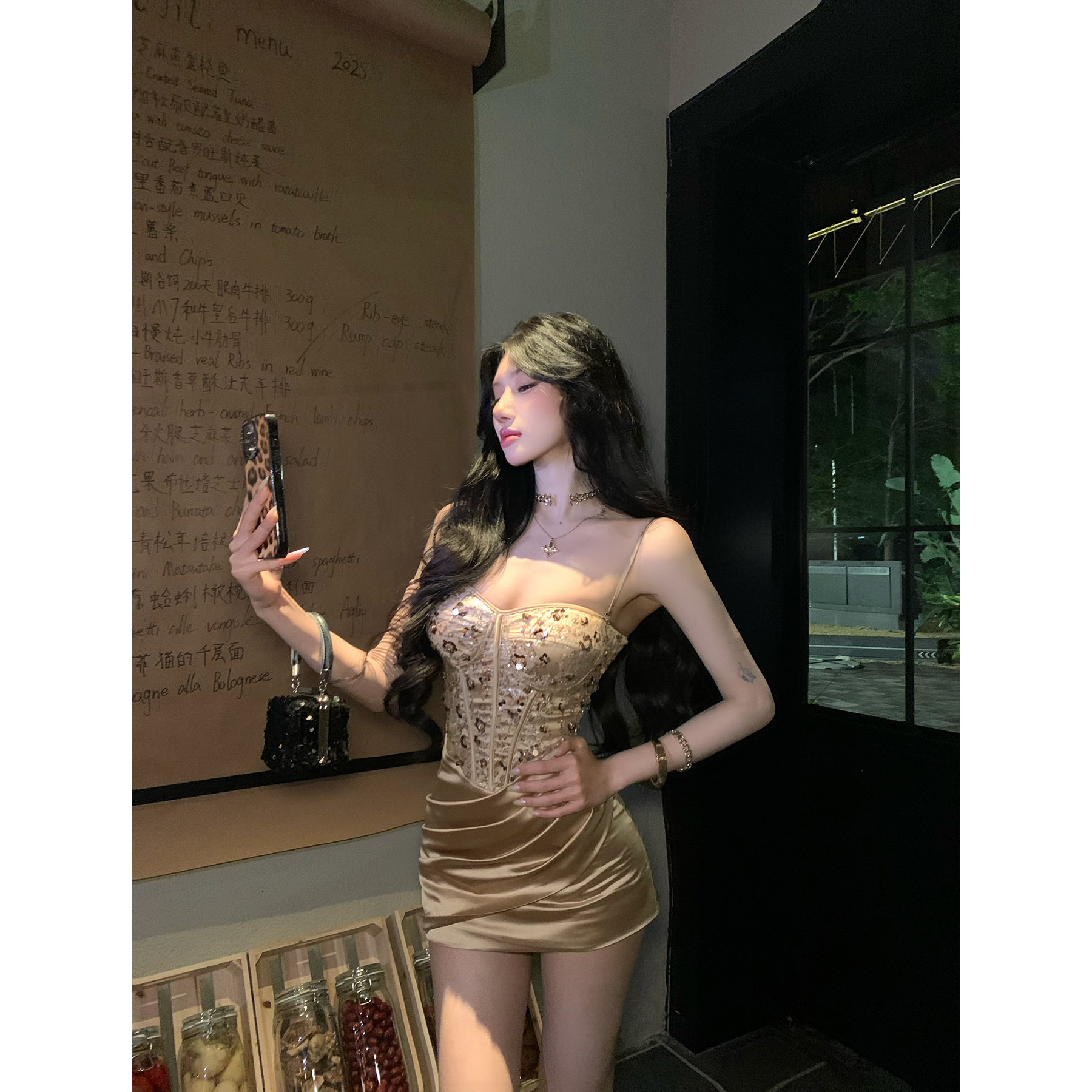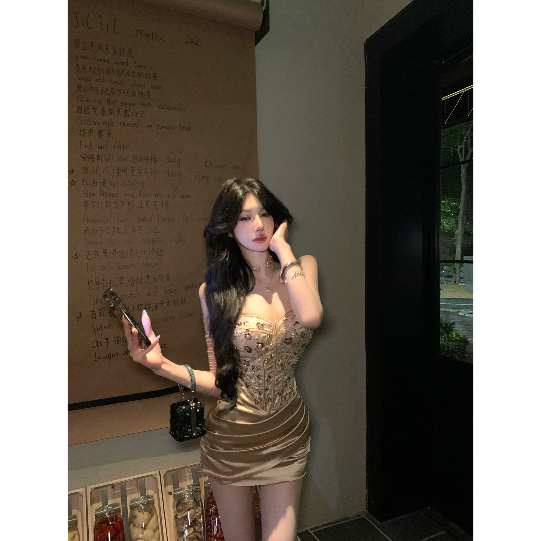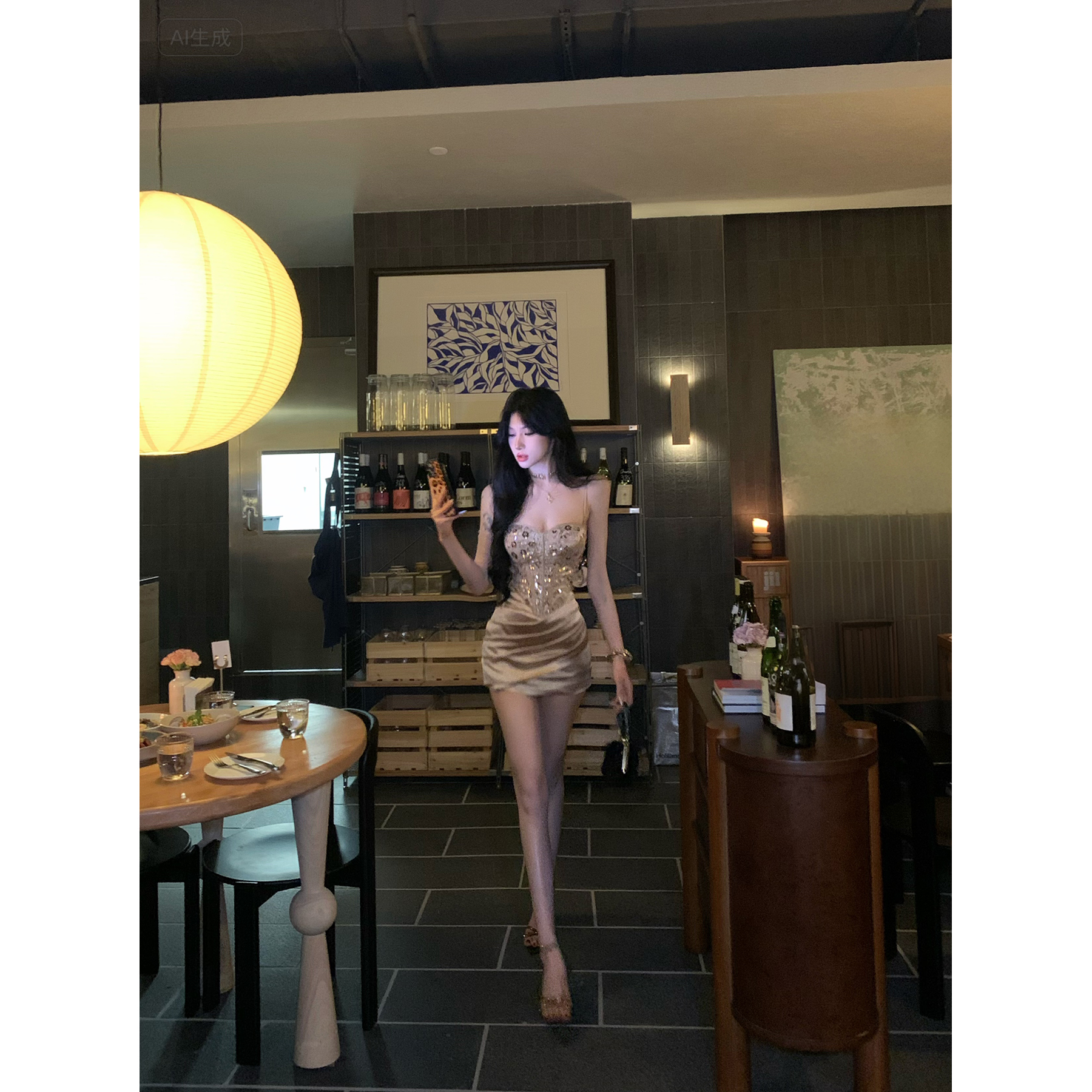 牛了牛了 法式吊带连衣裙女2025冬季抹胸性感包臀裙拼接宴会裙子