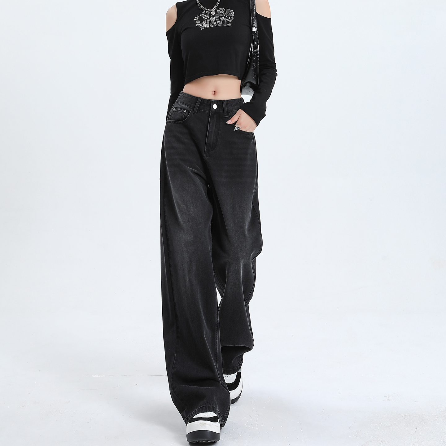 新款黑灰窄版阔腿牛仔裤女直筒宽松显瘦秋冬高腰加绒九分裤长裤子