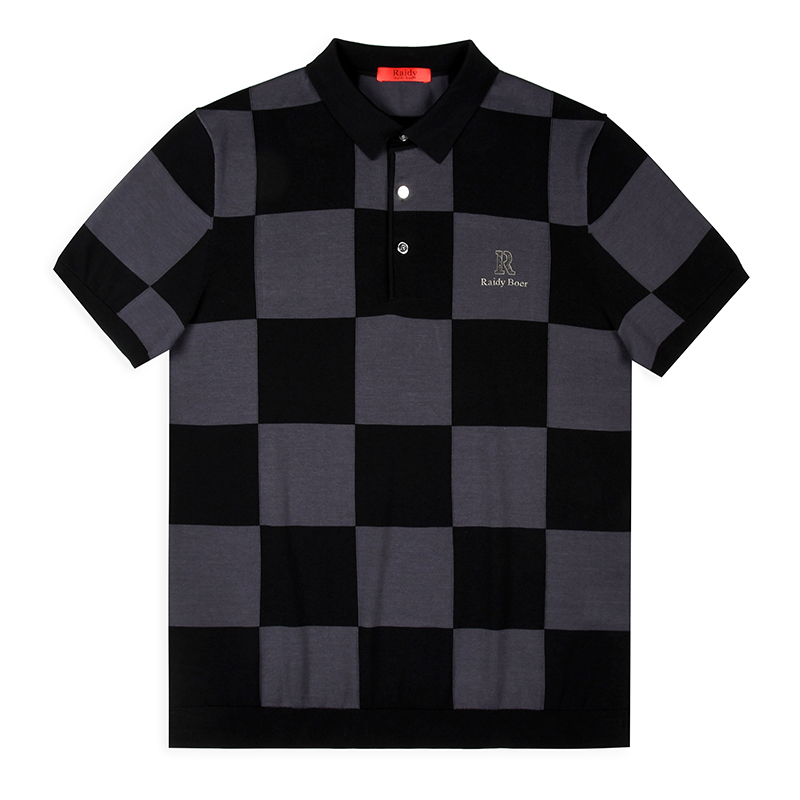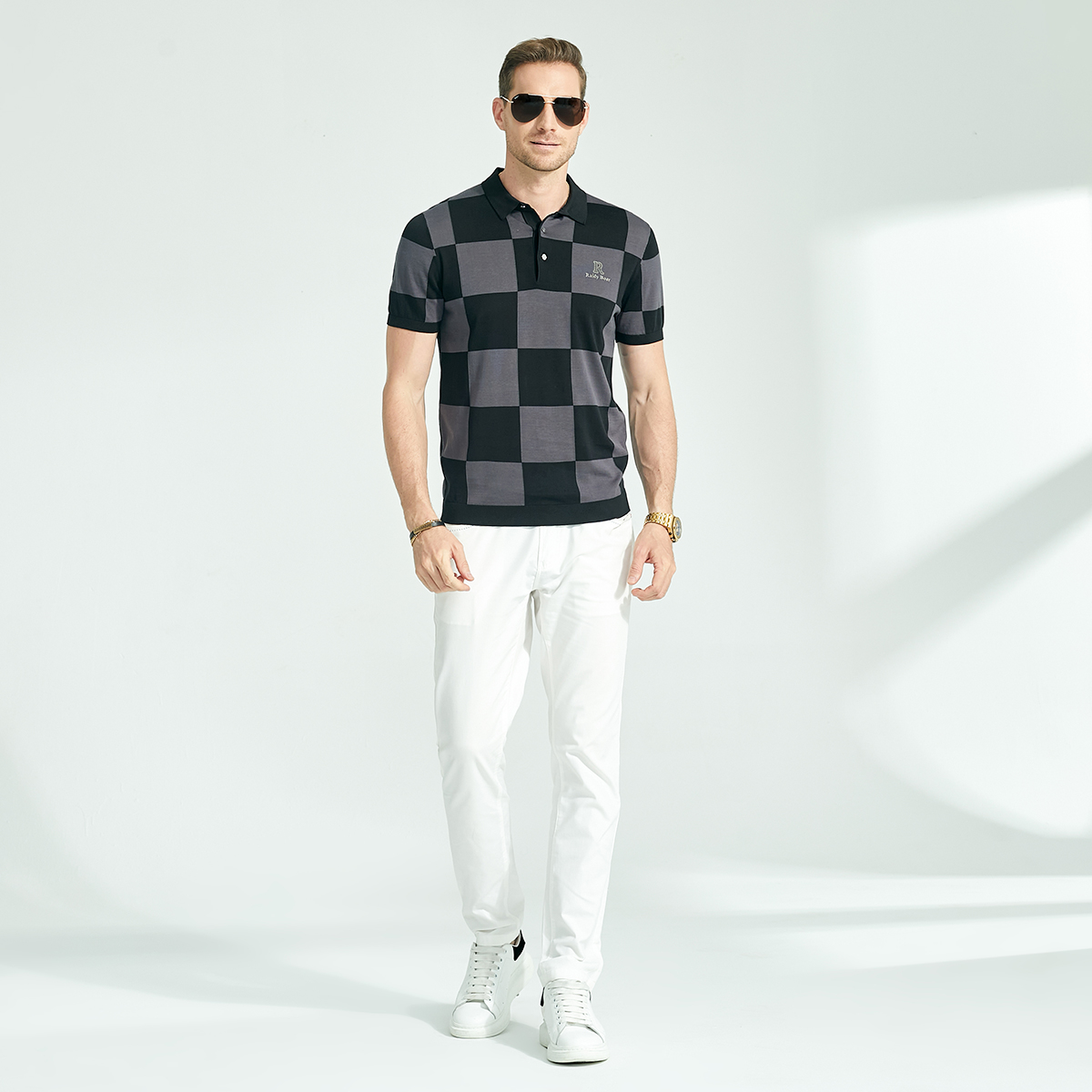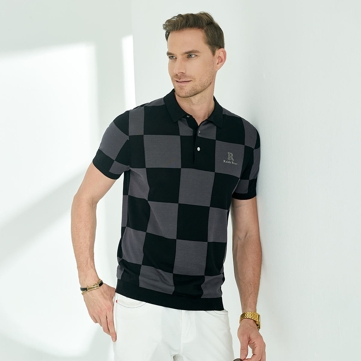 雷迪波尔男装短袖T恤夏季新品翻领含桑蚕丝透气格纹针织修身上衣