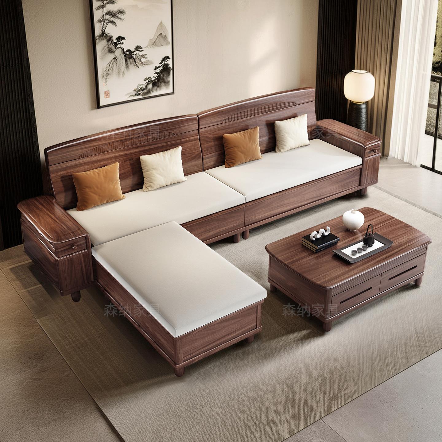 厚实黑胡桃木实木沙发新中式储物两用贵妃转角沙发小户型木沙发