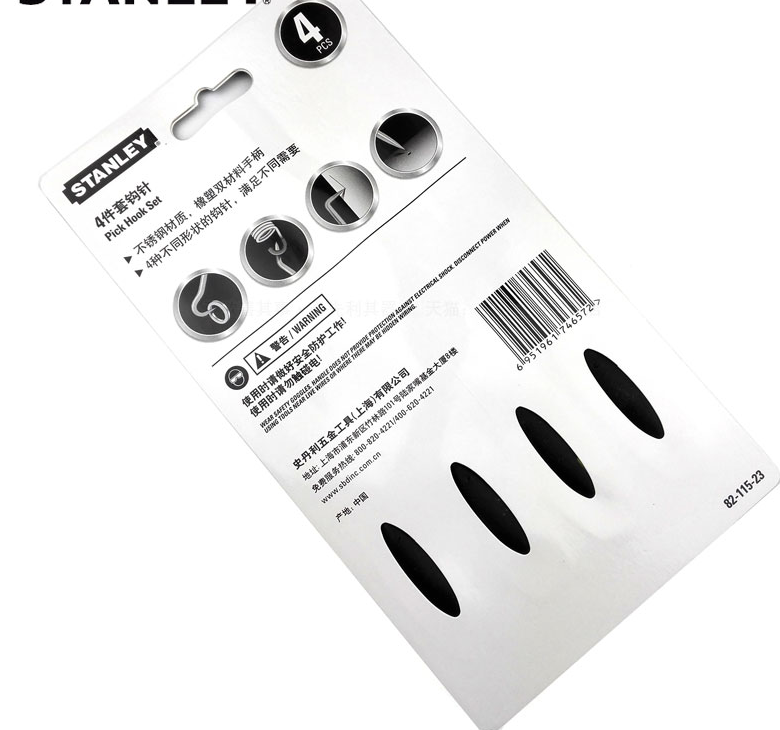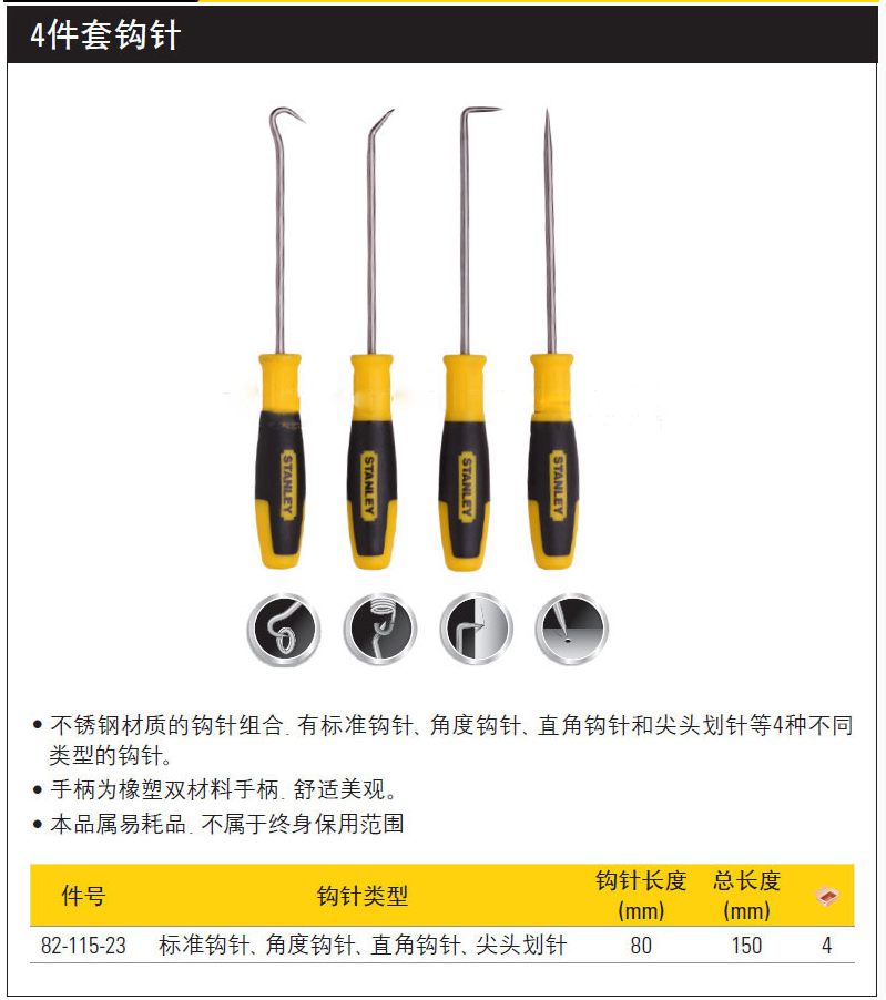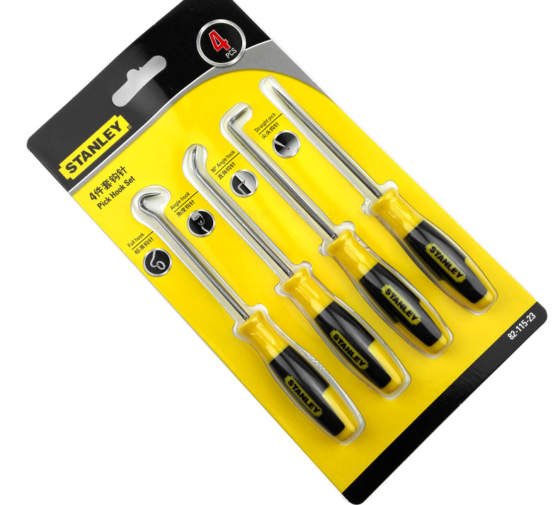 史丹利82-115 4件套钩针标准角度直角钩针尖头划针挑钩缝组套工具
