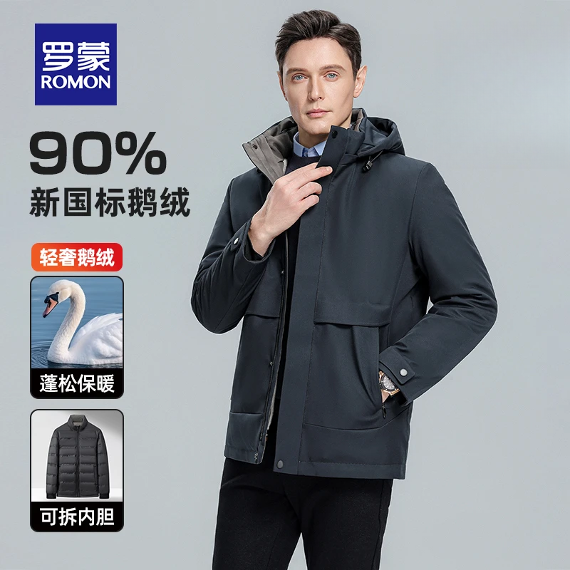 银狐绒+90鹅绒-多穿罗蒙男士羊毛仿貂绒可脱卸羽绒服冬季双保暖