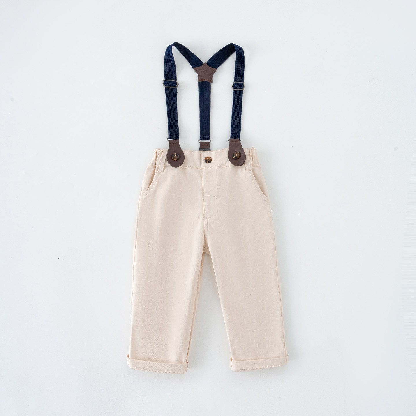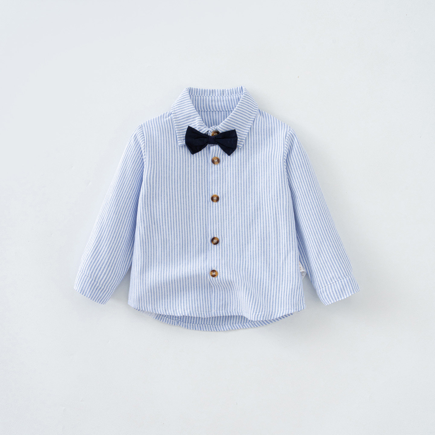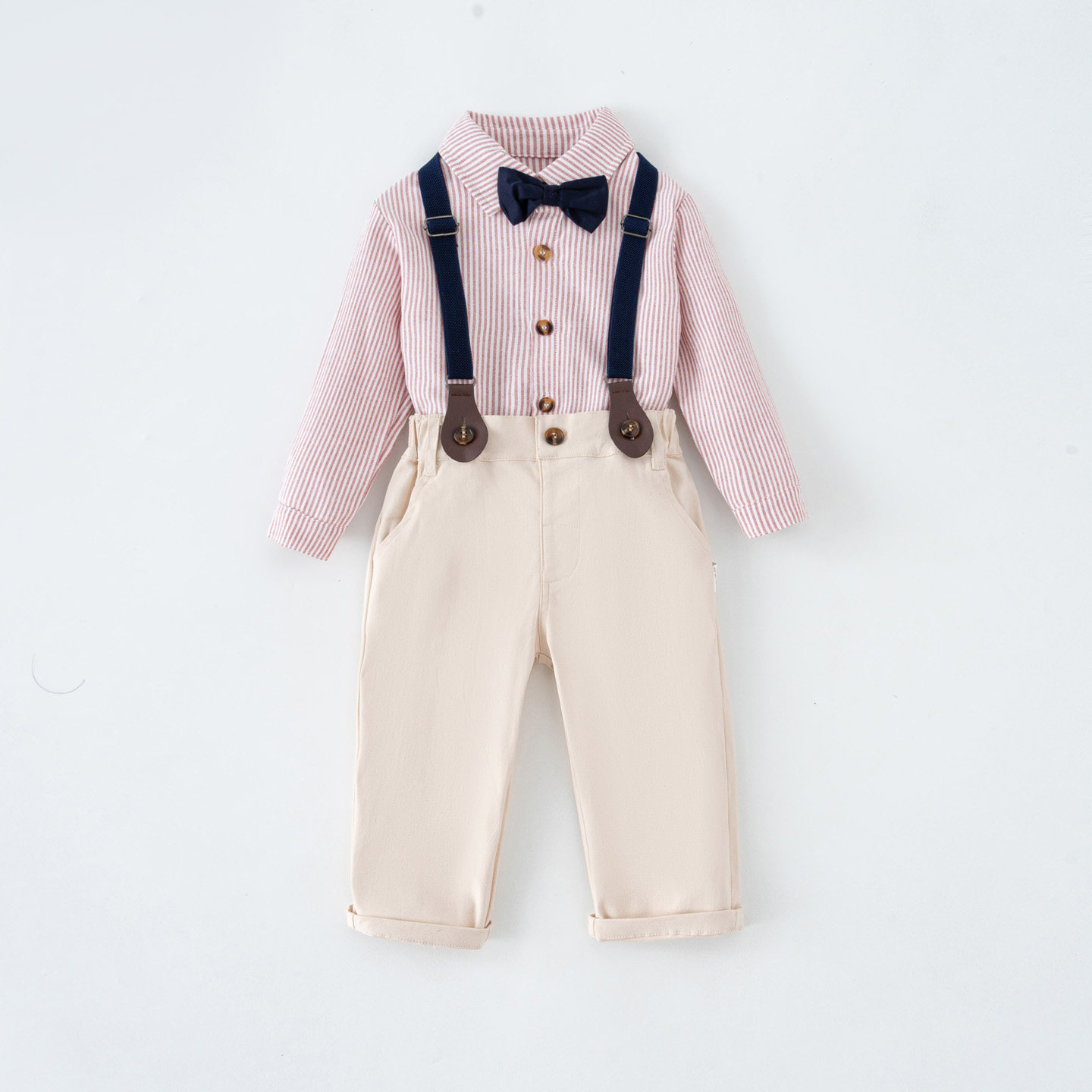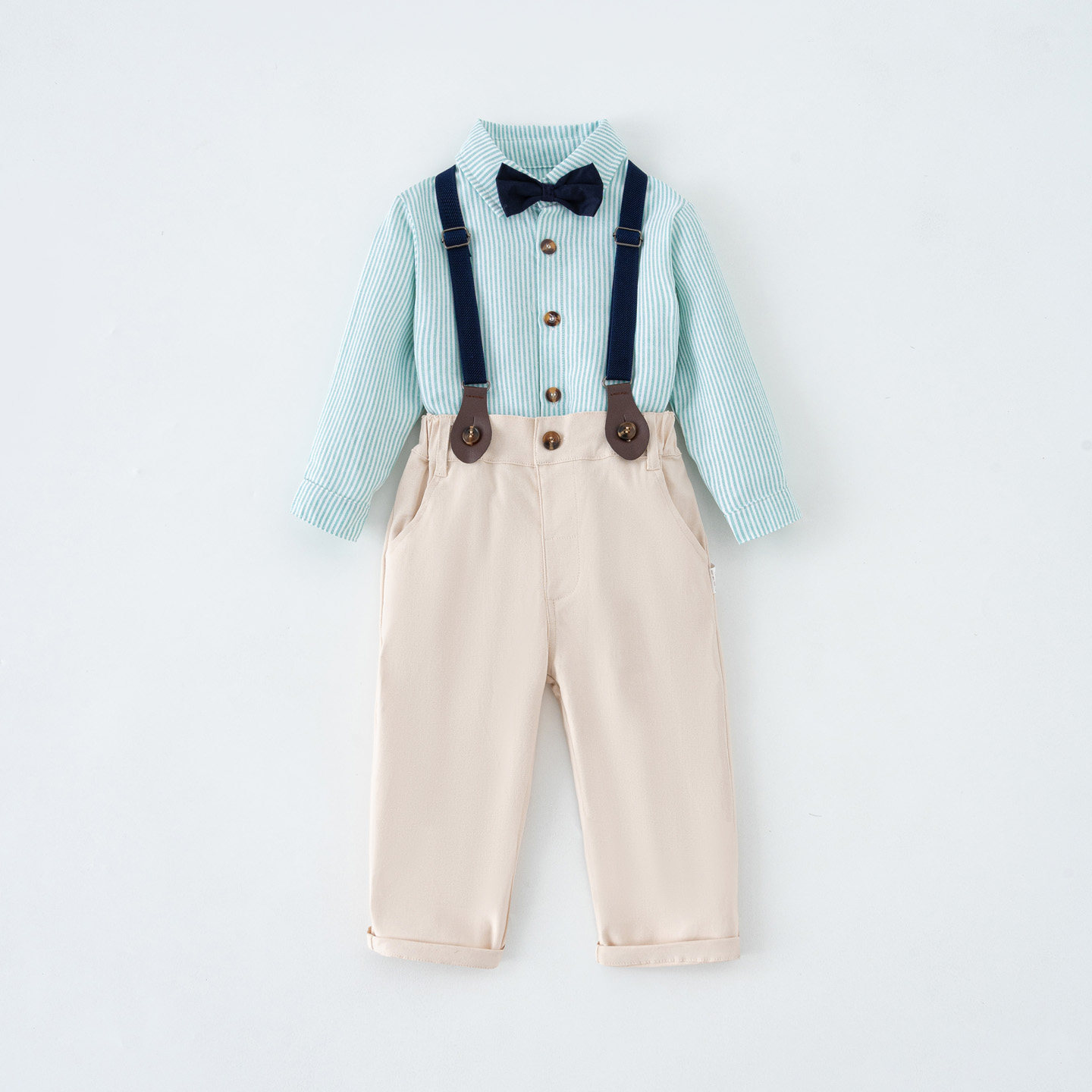 男童长袖衬衫2025新款婴儿衬衣宝宝秋季条纹花童礼服裤子背带套装