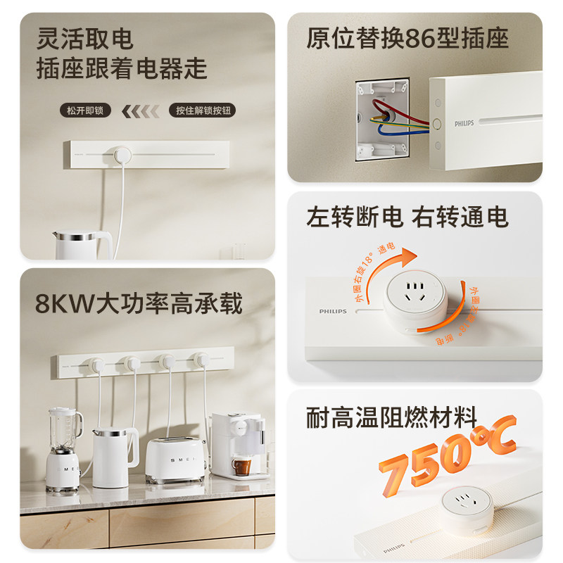 【15%】飞利浦超薄明装多功能电力可移动轨道插座餐边柜客厅书房