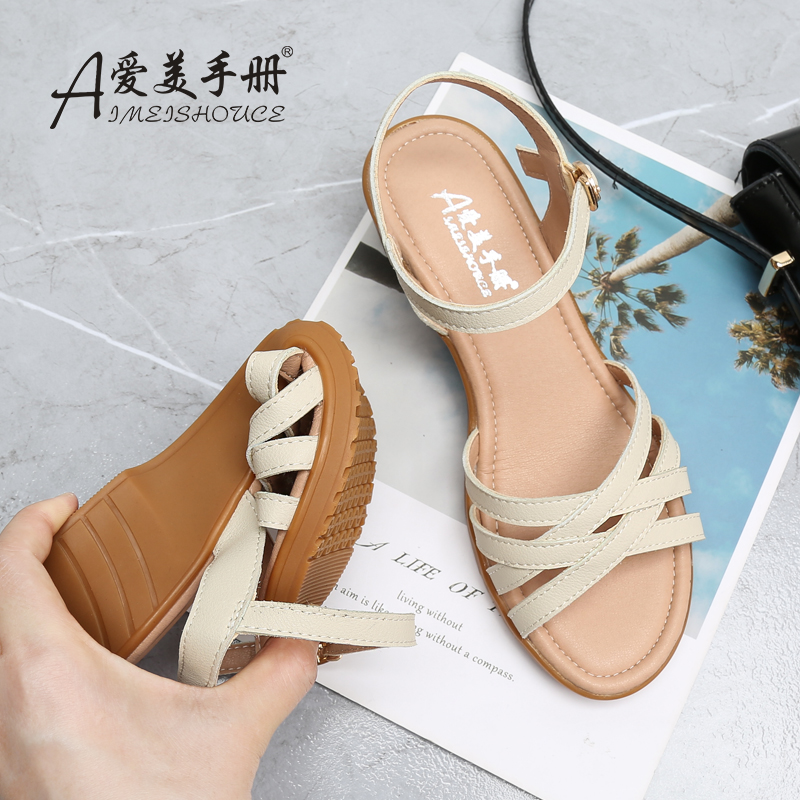 一字扣坡跟皮凉鞋女平底鞋舒适软底妈妈鞋女凉鞋皮春夏季大码女鞋
