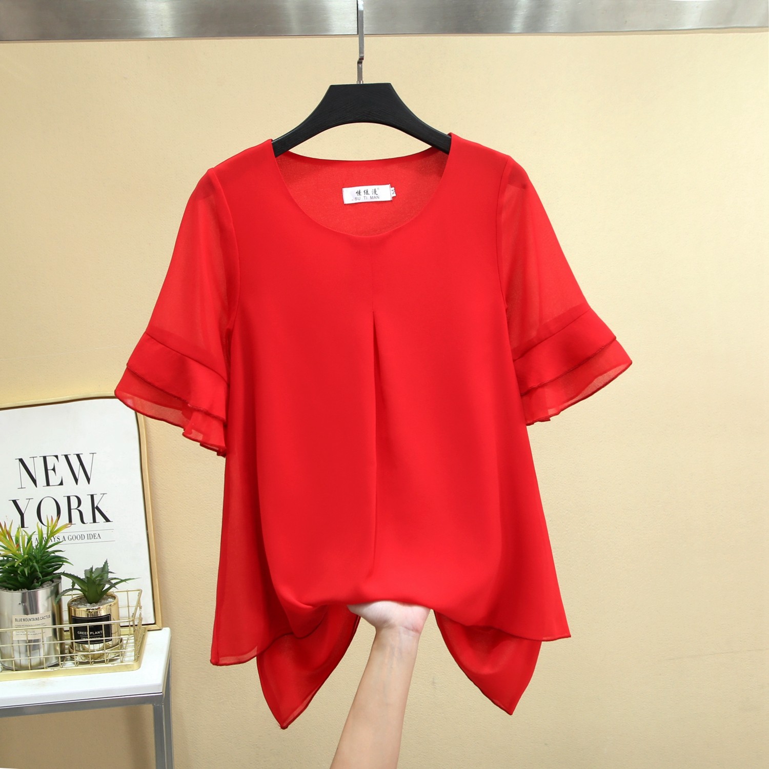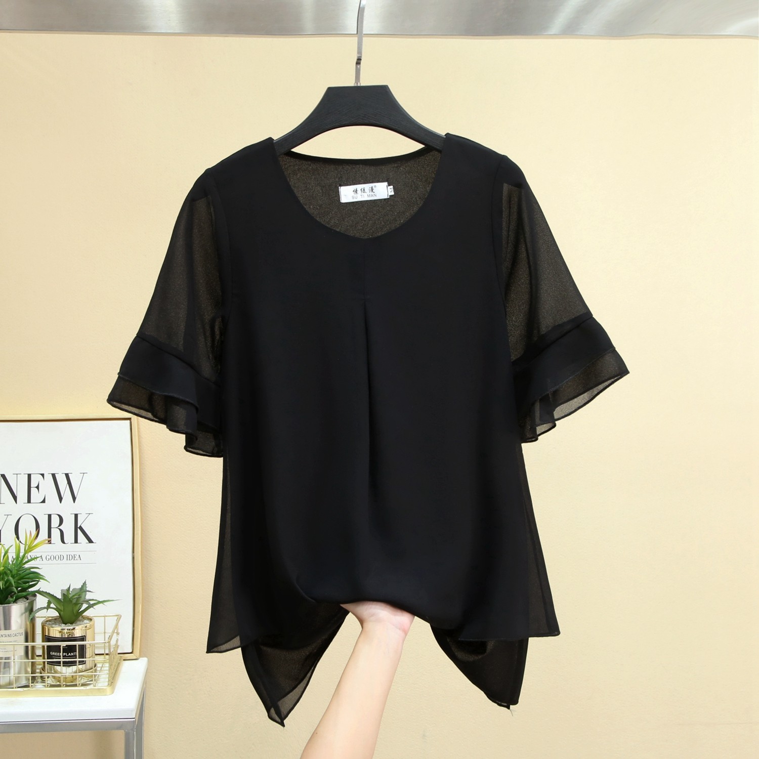 2025新款大码女装夏季遮肚子圆领宽松百搭荷叶袖雪纺衫短袖上衣女