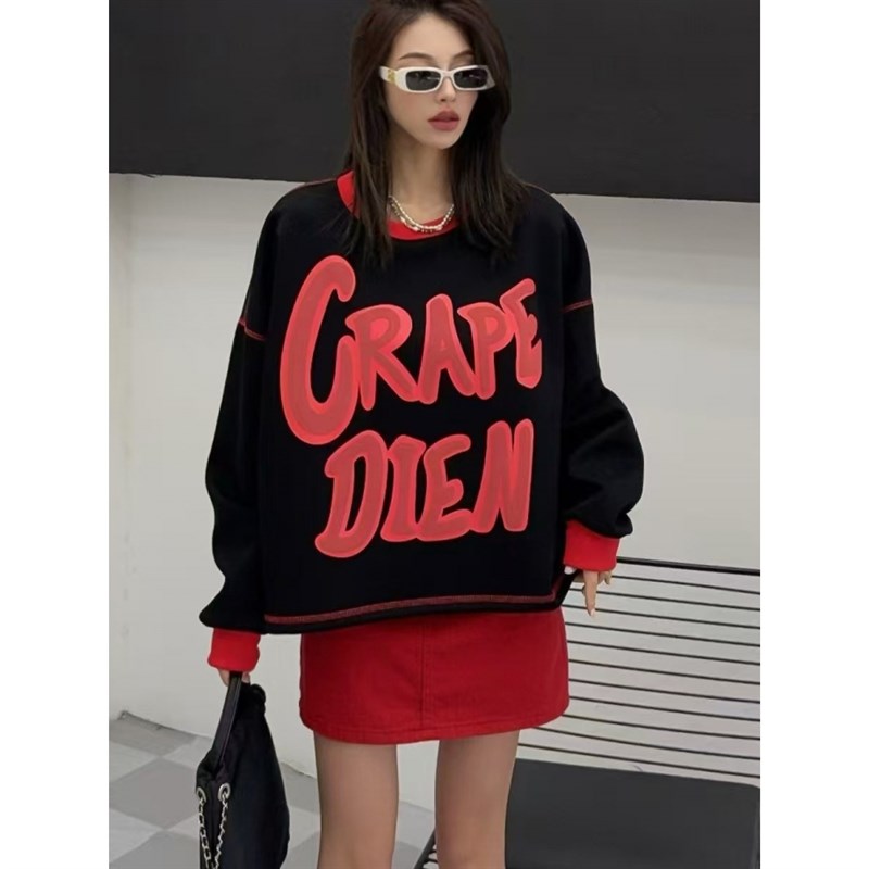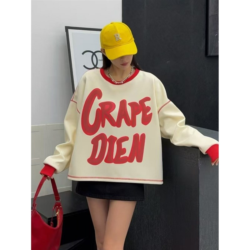 时尚新款休闲宽松2025春季卫衣女美式字母爱心印花圆领长袖上衣