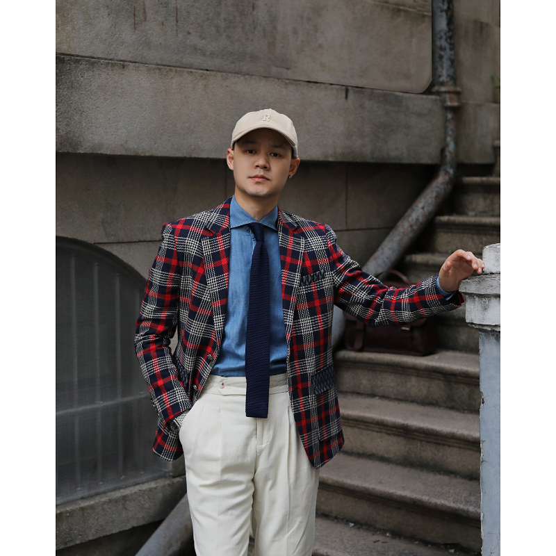 英伦复古修身苏格兰格纹红色格子拼接设计感特色文艺绅士西服外套