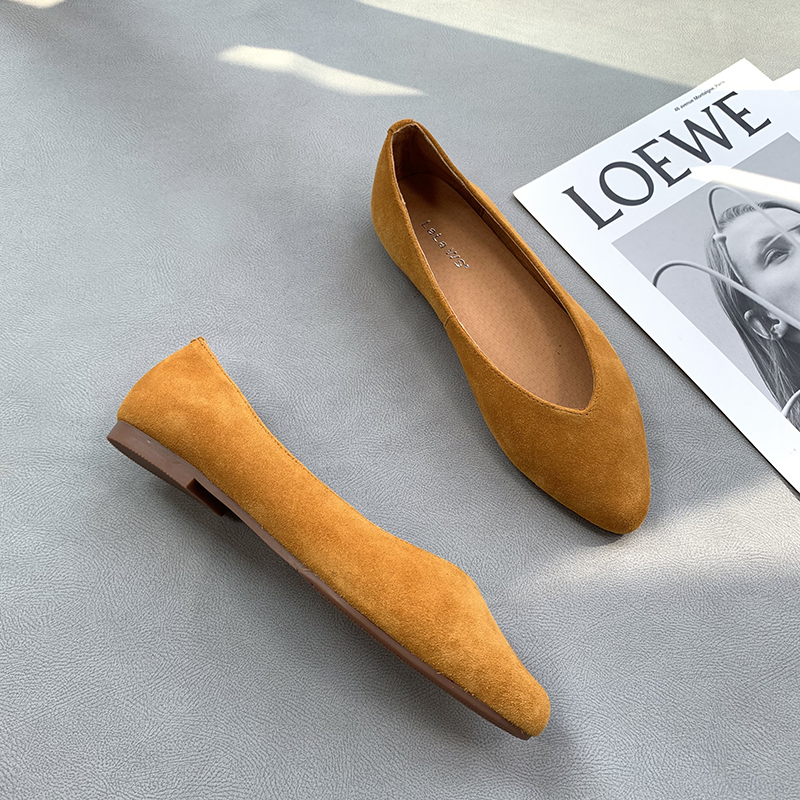 新款磨砂皮尖头浅口平底单鞋2025春季软底百搭V口复古真皮奶奶鞋