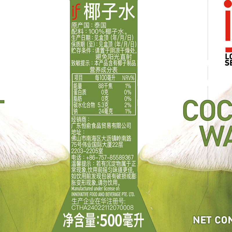 泰国进口if椰子水清爽微甜饮料500ml*4大瓶