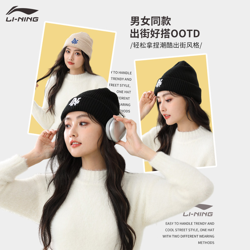李宁正品帽子男冬季新款防风防寒保暖加绒针织帽情侣运动毛线帽女