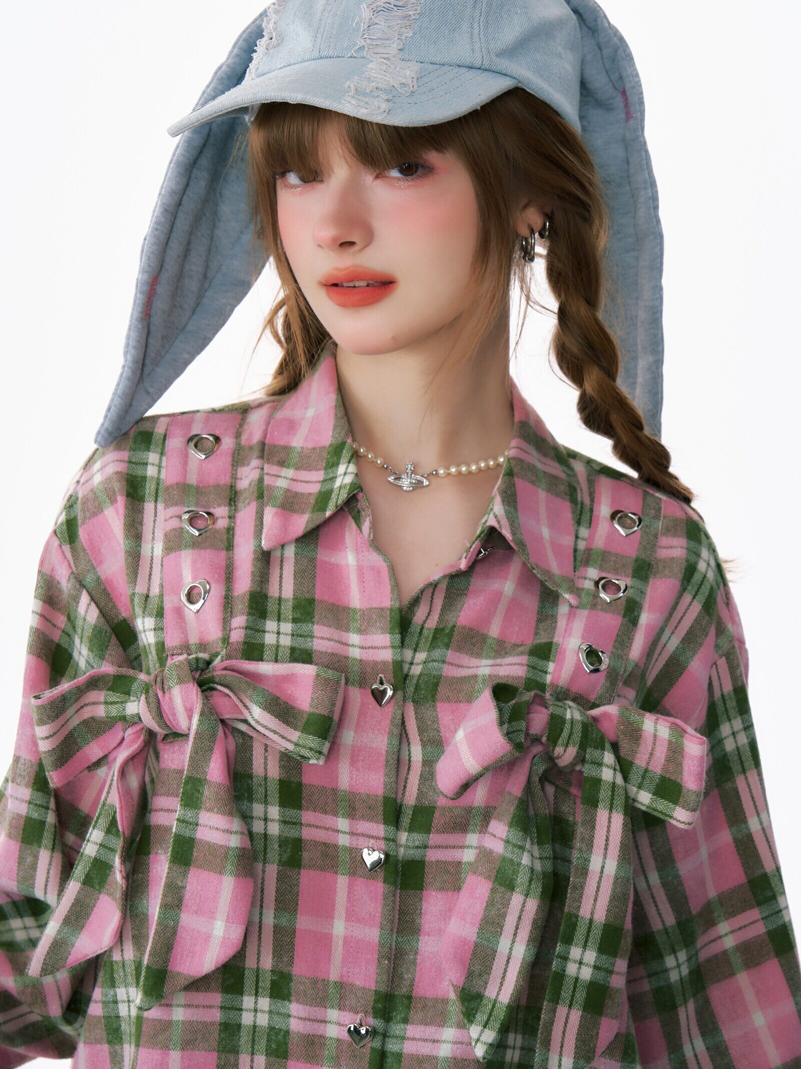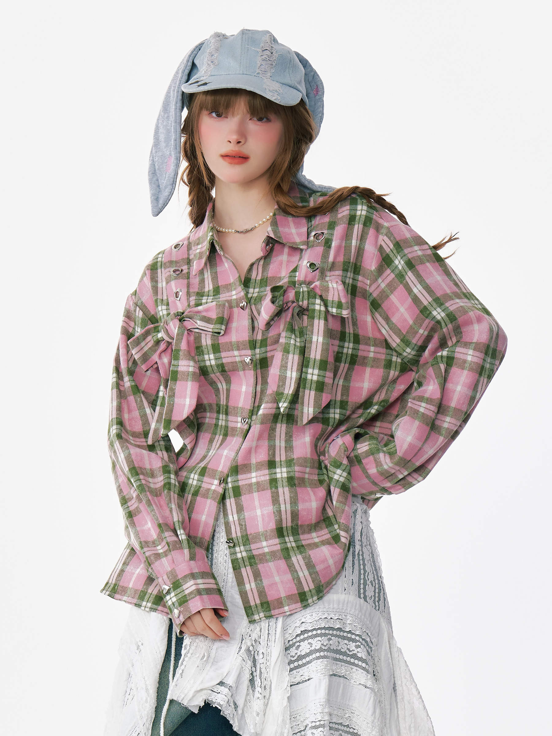 ziziFei秋冬美式复古设计感格纹加厚磨毛宽松粉色格子衬衫外套女