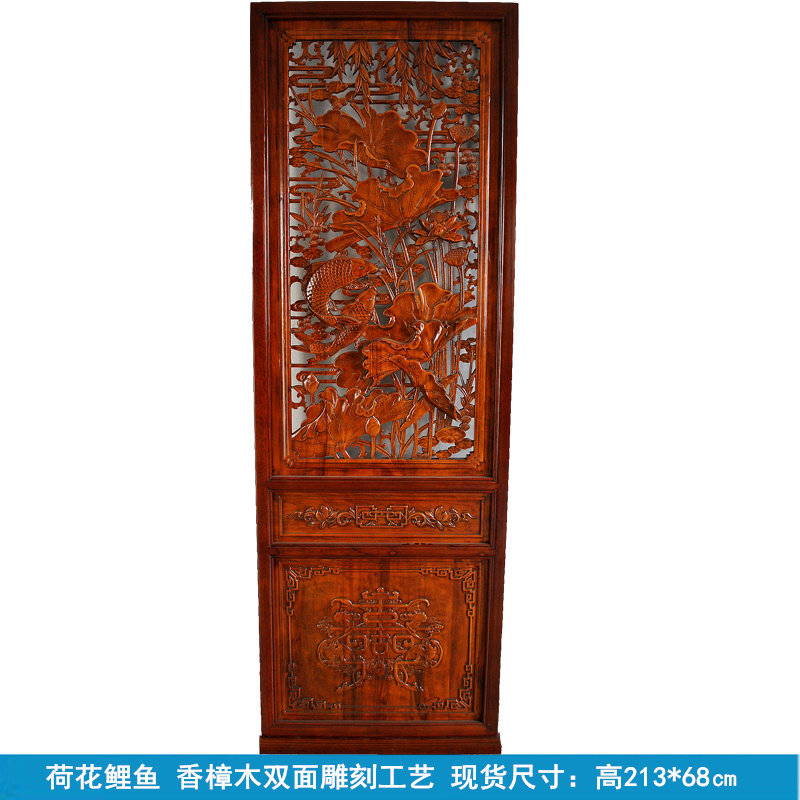 东阳木雕屏风玄关客厅隔断中式实木雕刻镂空荷花鲤鱼仿古门窗花格