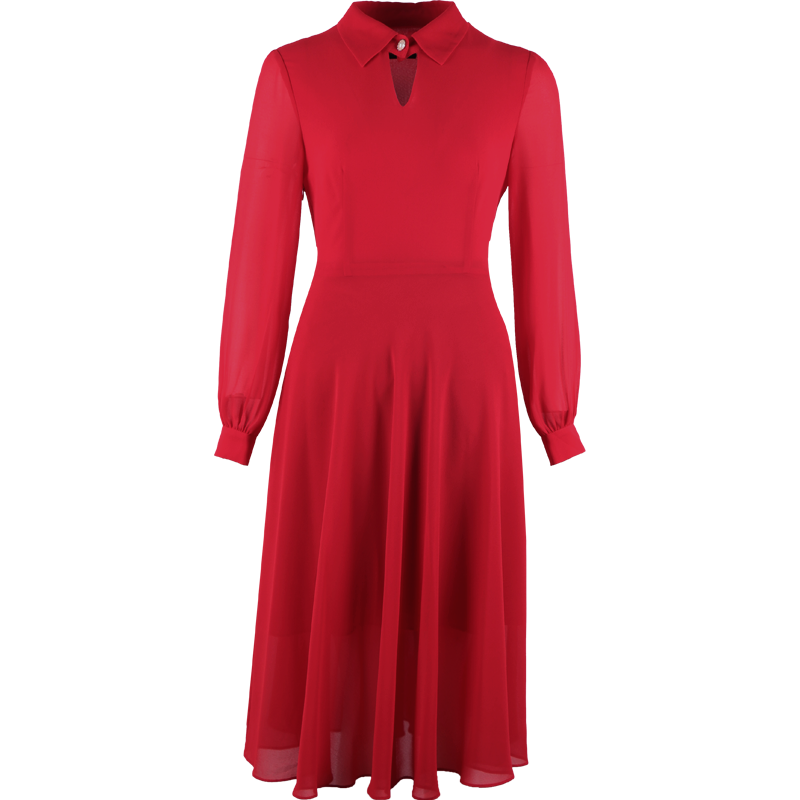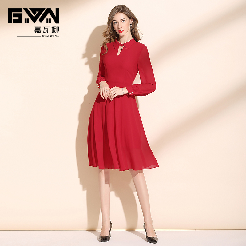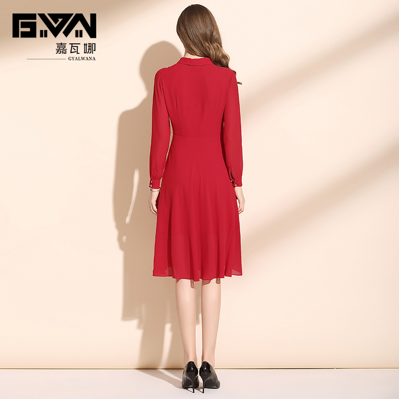 春款裙子2025年新款气质红色连衣裙显瘦长袖收腰翻领气质雪纺裙女