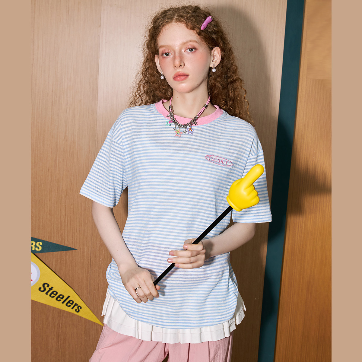coolhut撞色条纹圆领短袖宽松2025夏季女式T恤少女字母刺绣潮