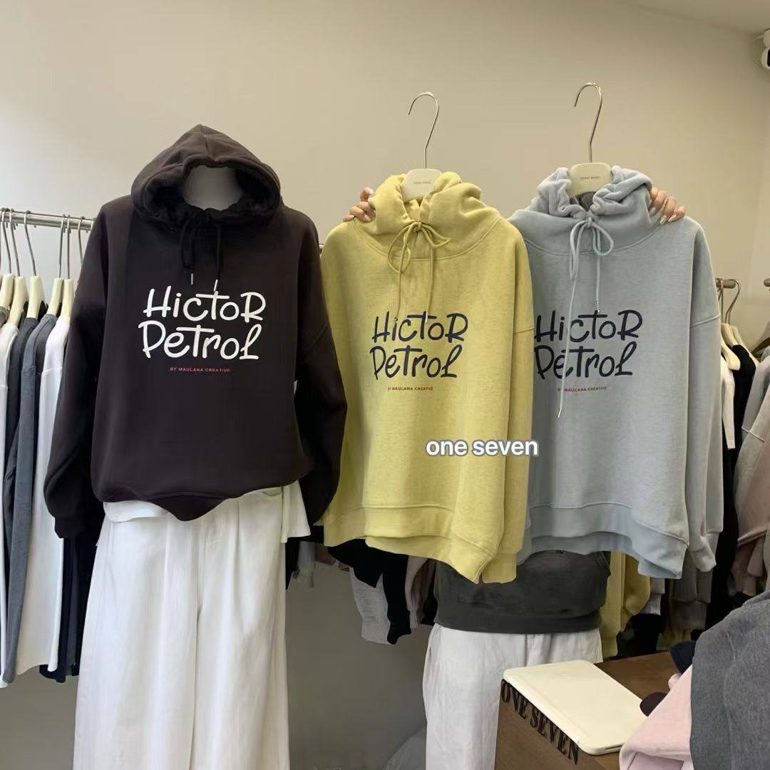 oneseven秋冬韩系字母印花连帽加绒卫衣女宽松加厚保暖上衣帽衫潮