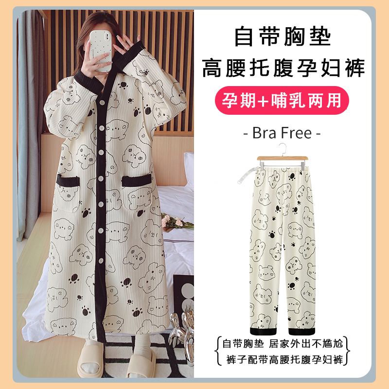 带胸垫春秋冬季空气棉加厚纯棉哺乳连衣睡裙月子服孕妇高腰托腹裤