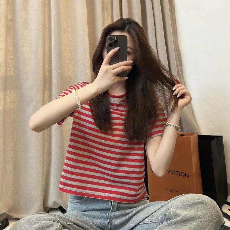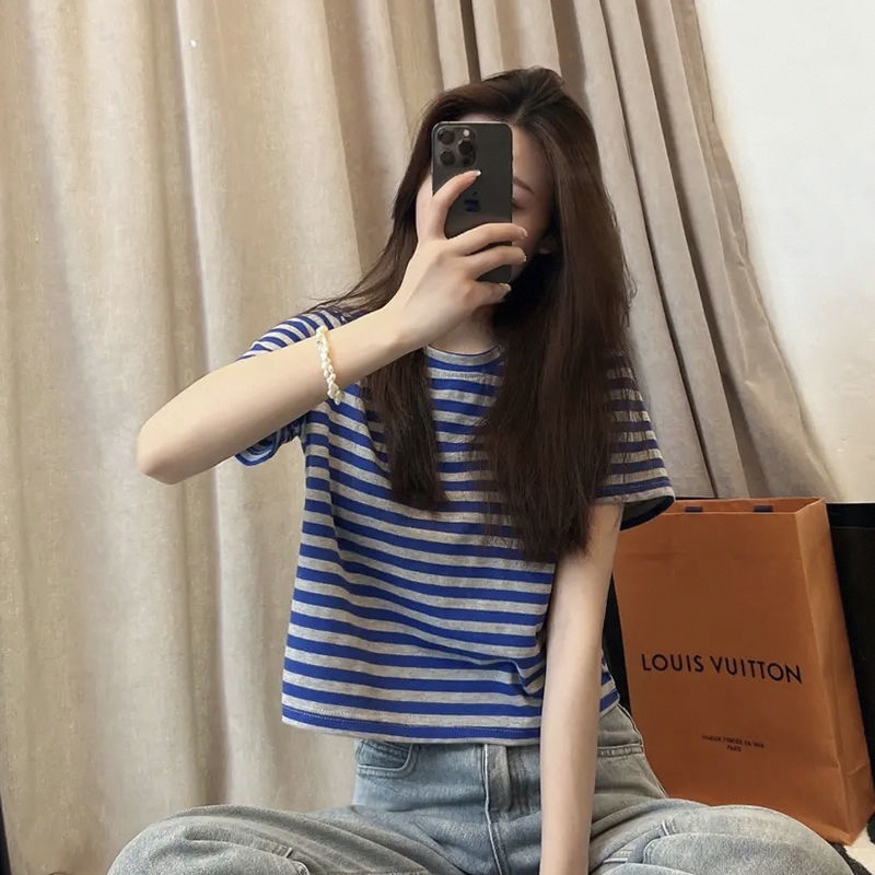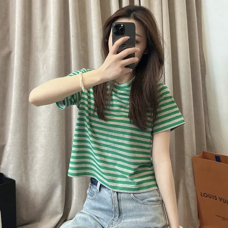 减龄时尚新款T恤条纹洋气女圆领上衣夏季短袖撞色全棉2025百搭潮