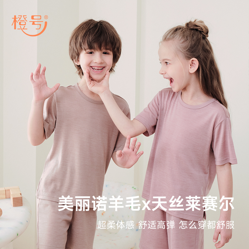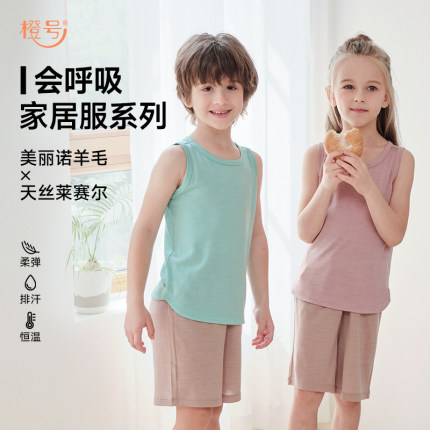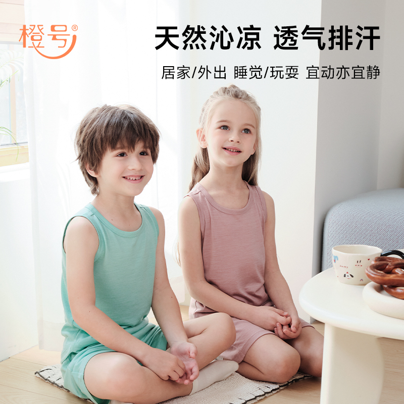 橙号儿童羊毛家居服薄吊带背心短裤男女孩打底吸湿排汗舒适夏季薄