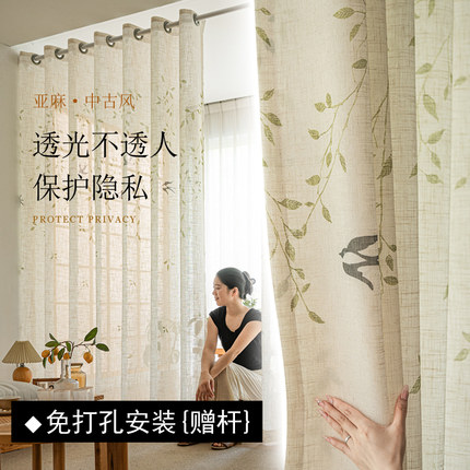 新中式窗帘纱帘免打孔2025新款客厅阳台隔断帘透光不透人亚麻纱布