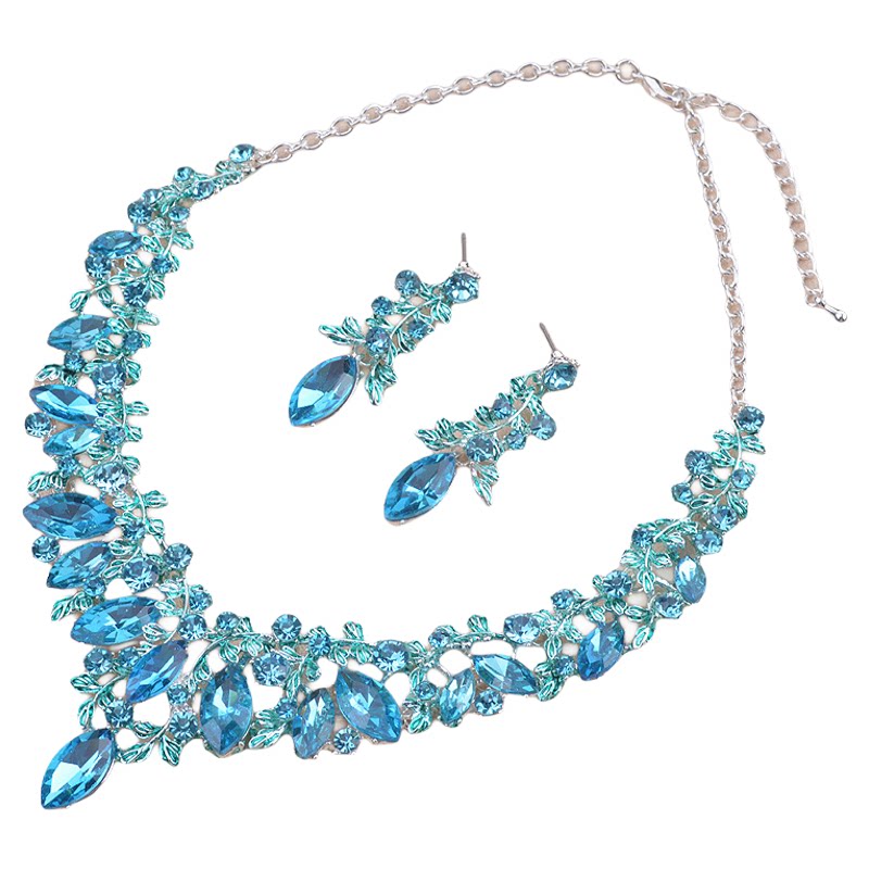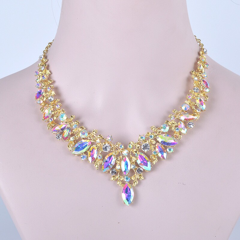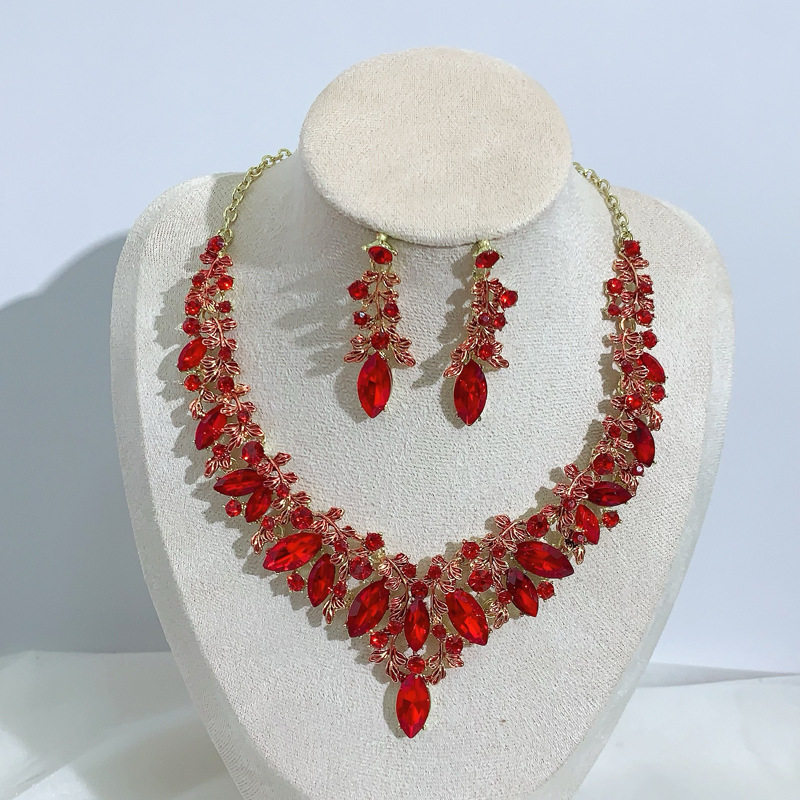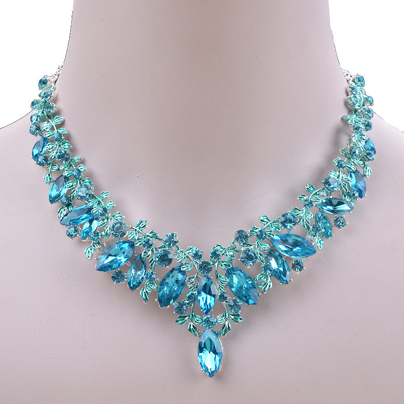 欧美精致小众水滴形水晶叶子项链耳环套装女闪亮晚宴礼服新娘首饰
