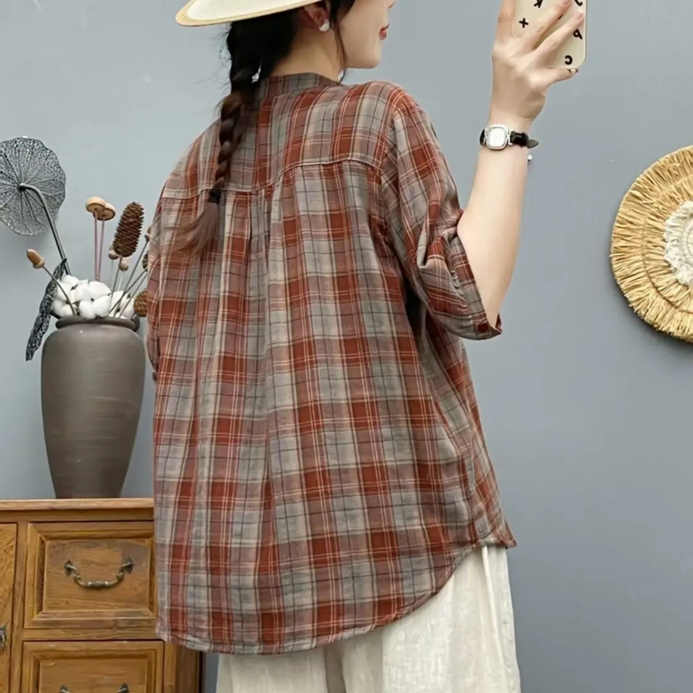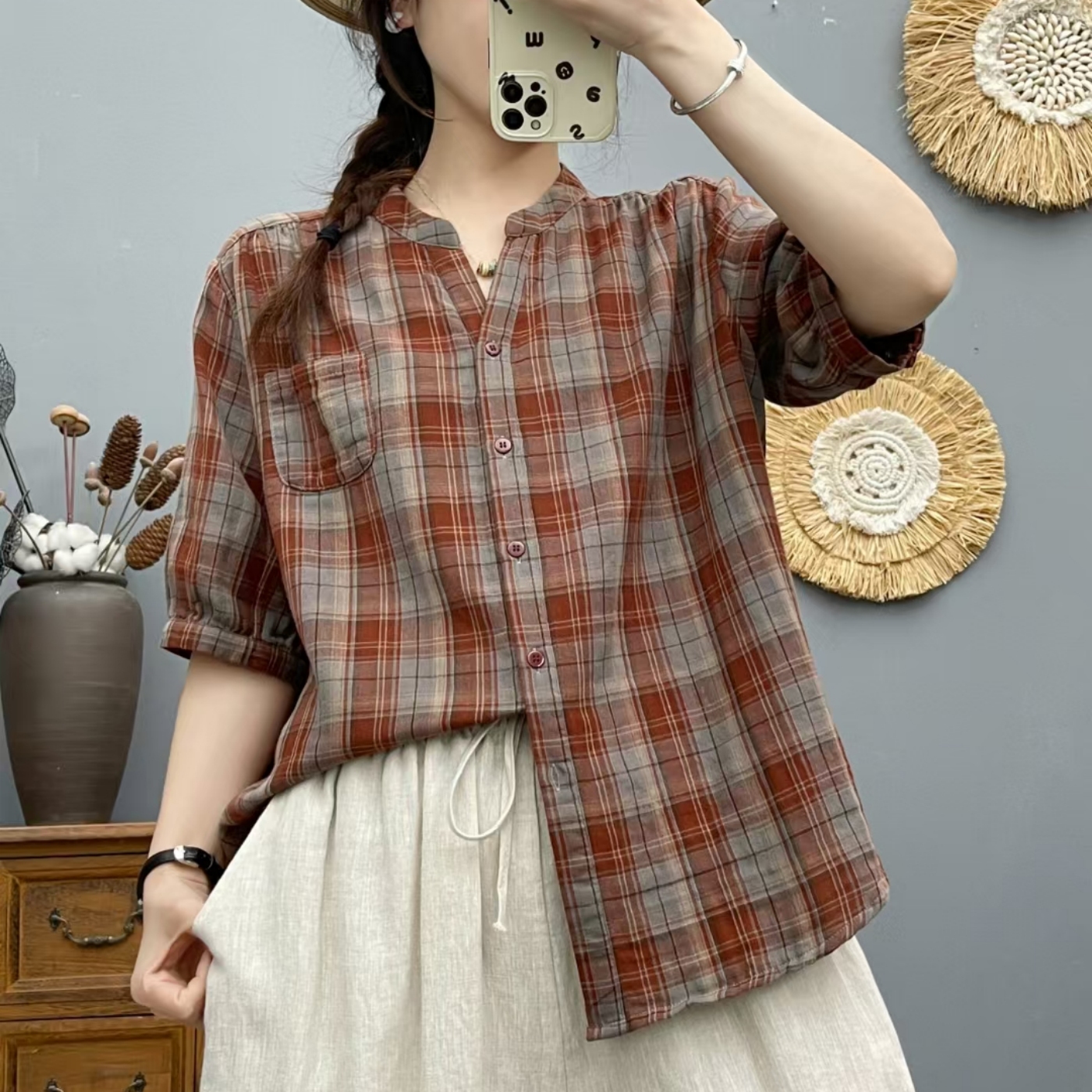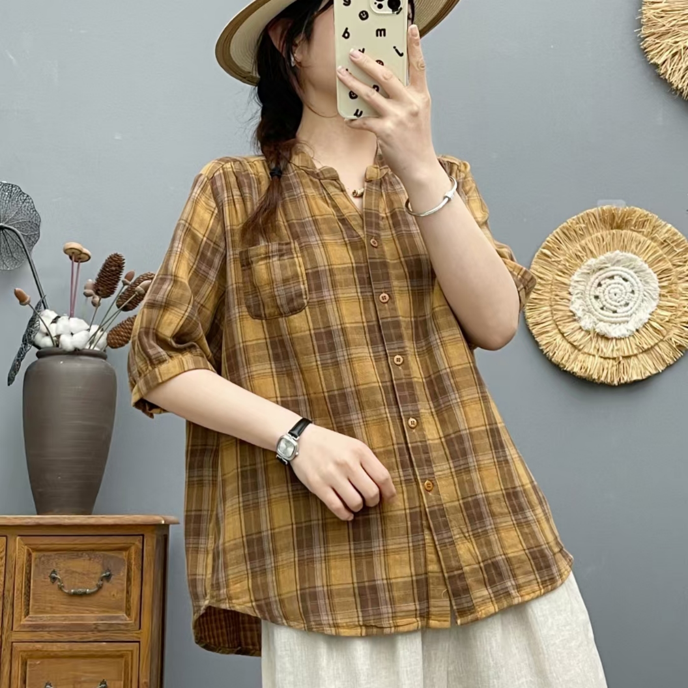 色织格纹衬衫2025夏季新款格纹纯棉气质减龄显瘦百搭复古休闲衬衣