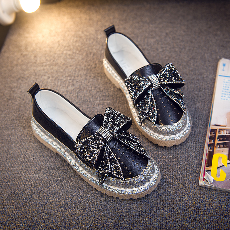 新款韩版豆豆鞋欧洲站蝴蝶结水钻软底女单鞋浅口休闲平底春秋套脚
