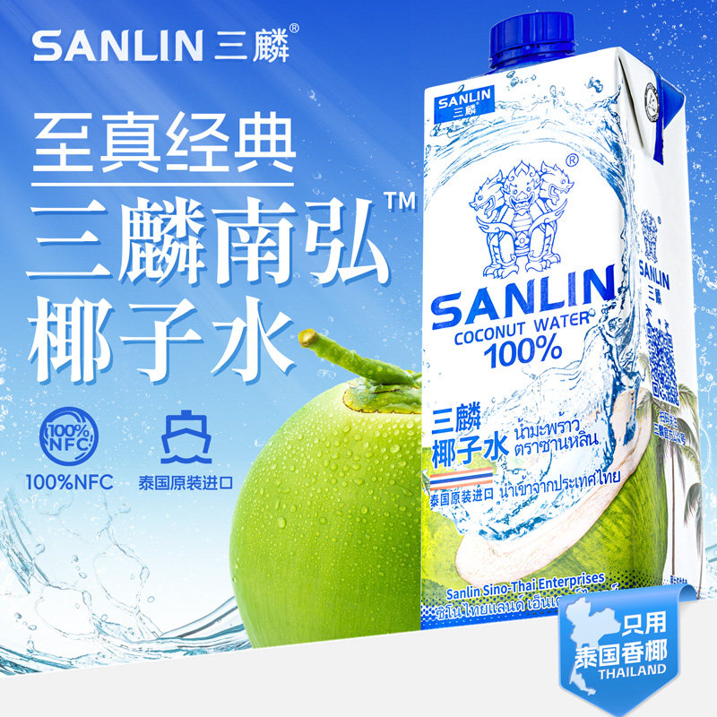 三麟泰国进口100%NFC椰子水椰青果汁1L*6瓶整箱