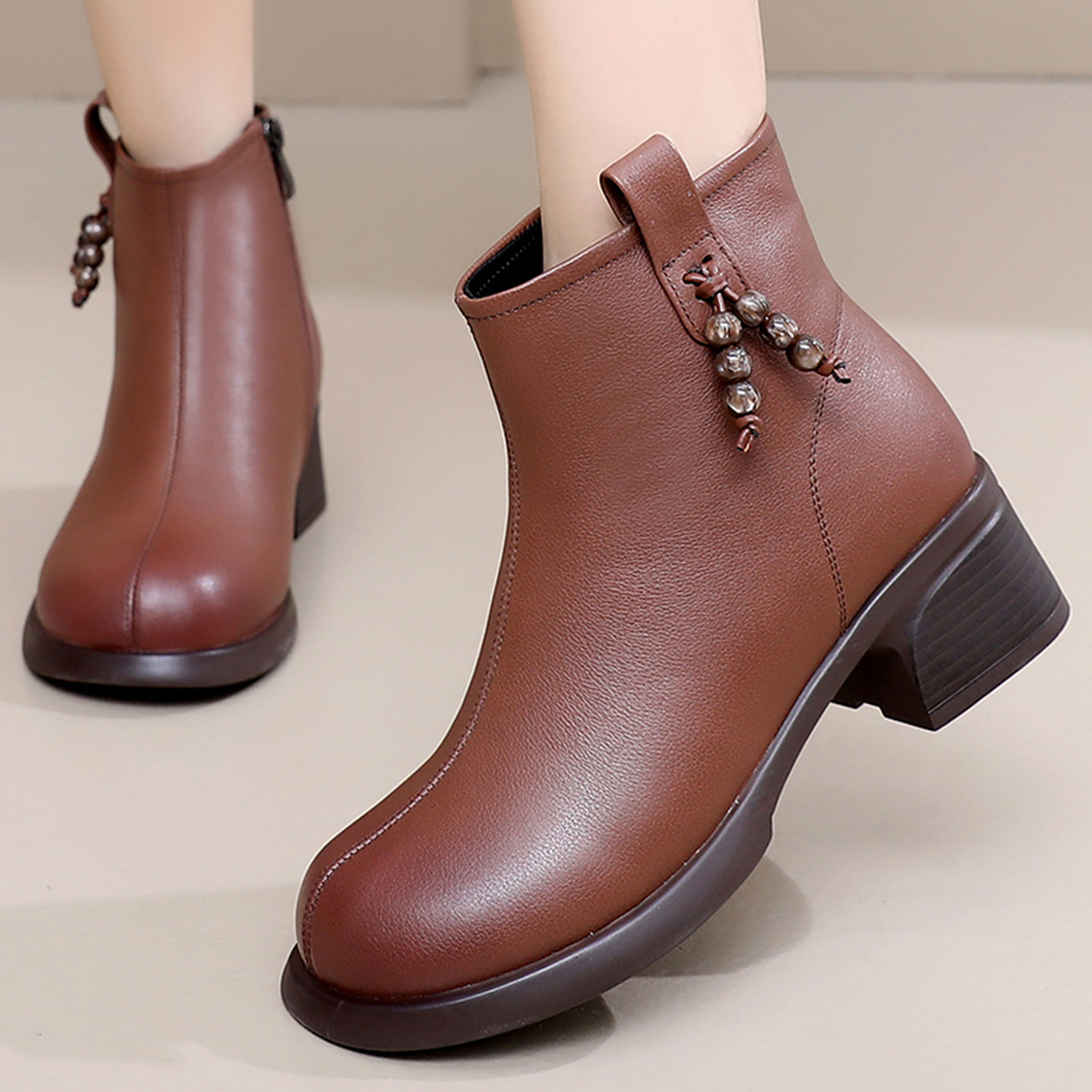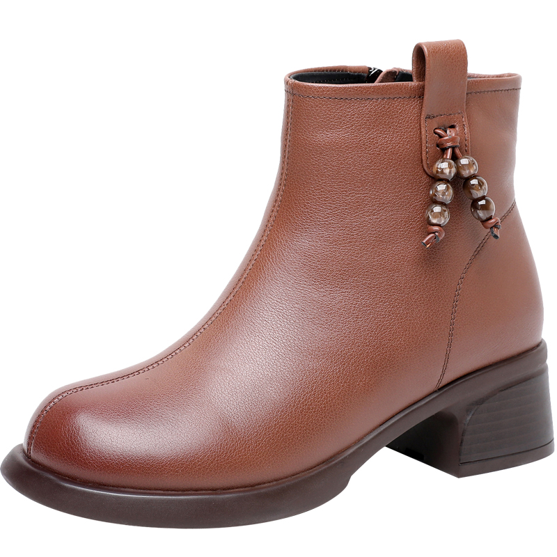 真皮厚底短靴女单靴子秋冬马丁靴复古圆头妈妈鞋粗跟软底加绒棉靴