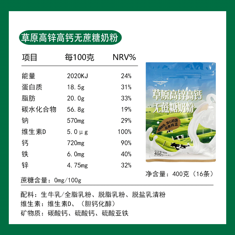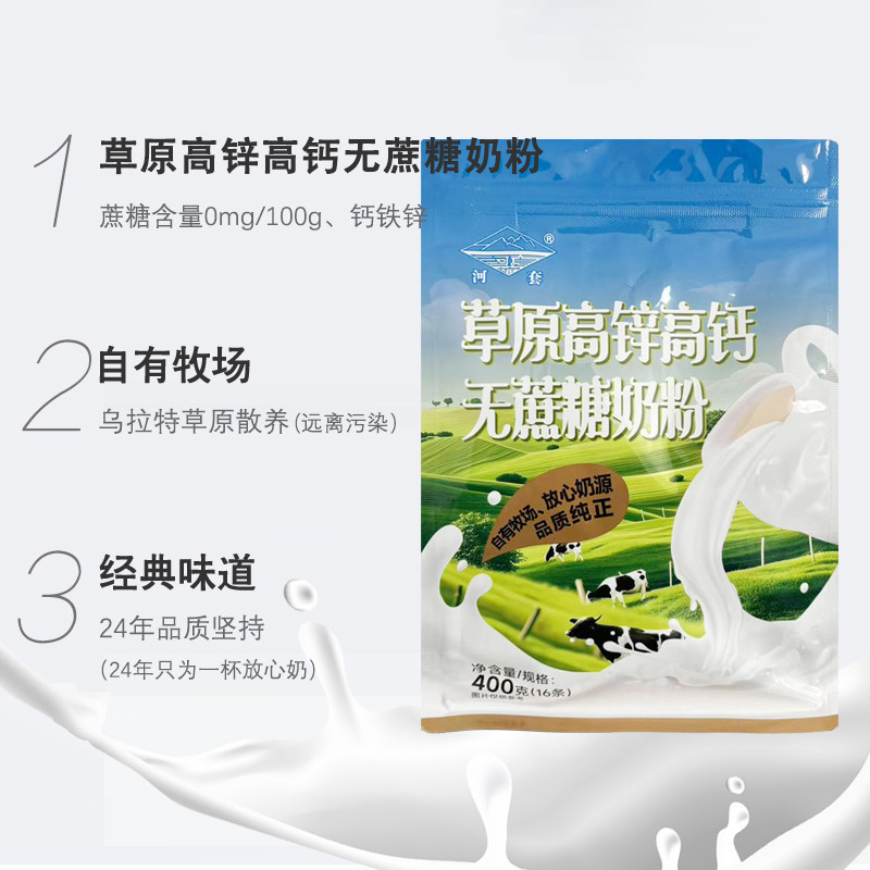 河套无蔗糖奶粉中老年400克高锌高钙多维男女士内小条装营养冲饮