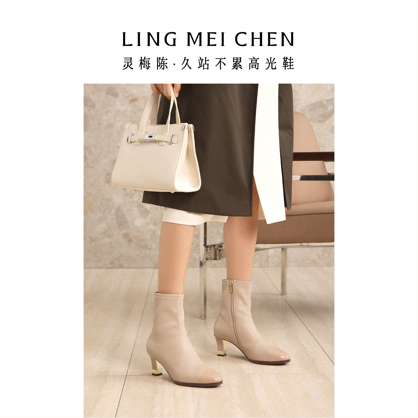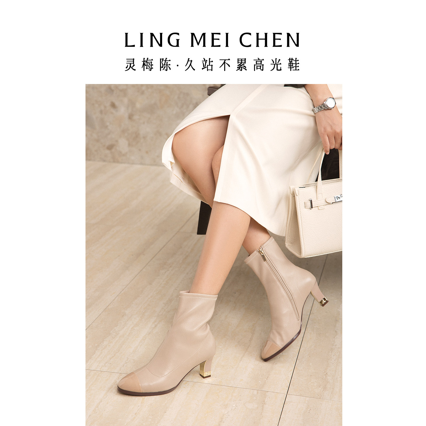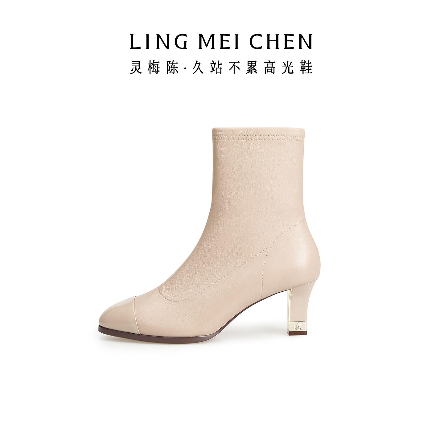 灵梅陈高光鞋白色短靴小香风粗跟弹力袜靴女靴高跟鞋冬靴子瘦瘦靴