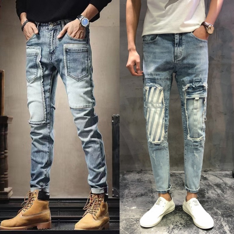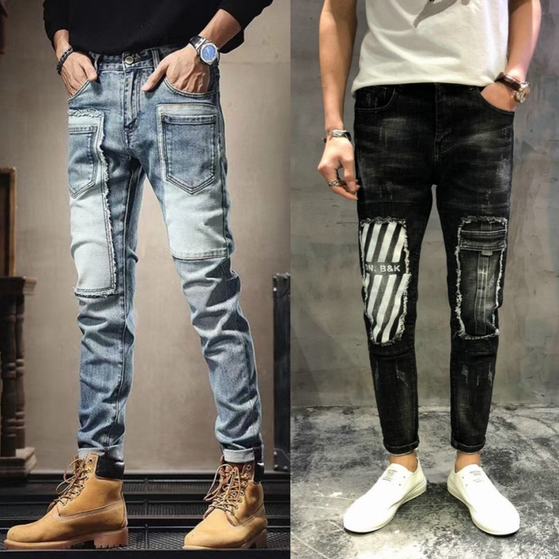高端潮牌个性拼接机车牛仔裤男士春秋季潮流帅气修身弹力小脚裤子