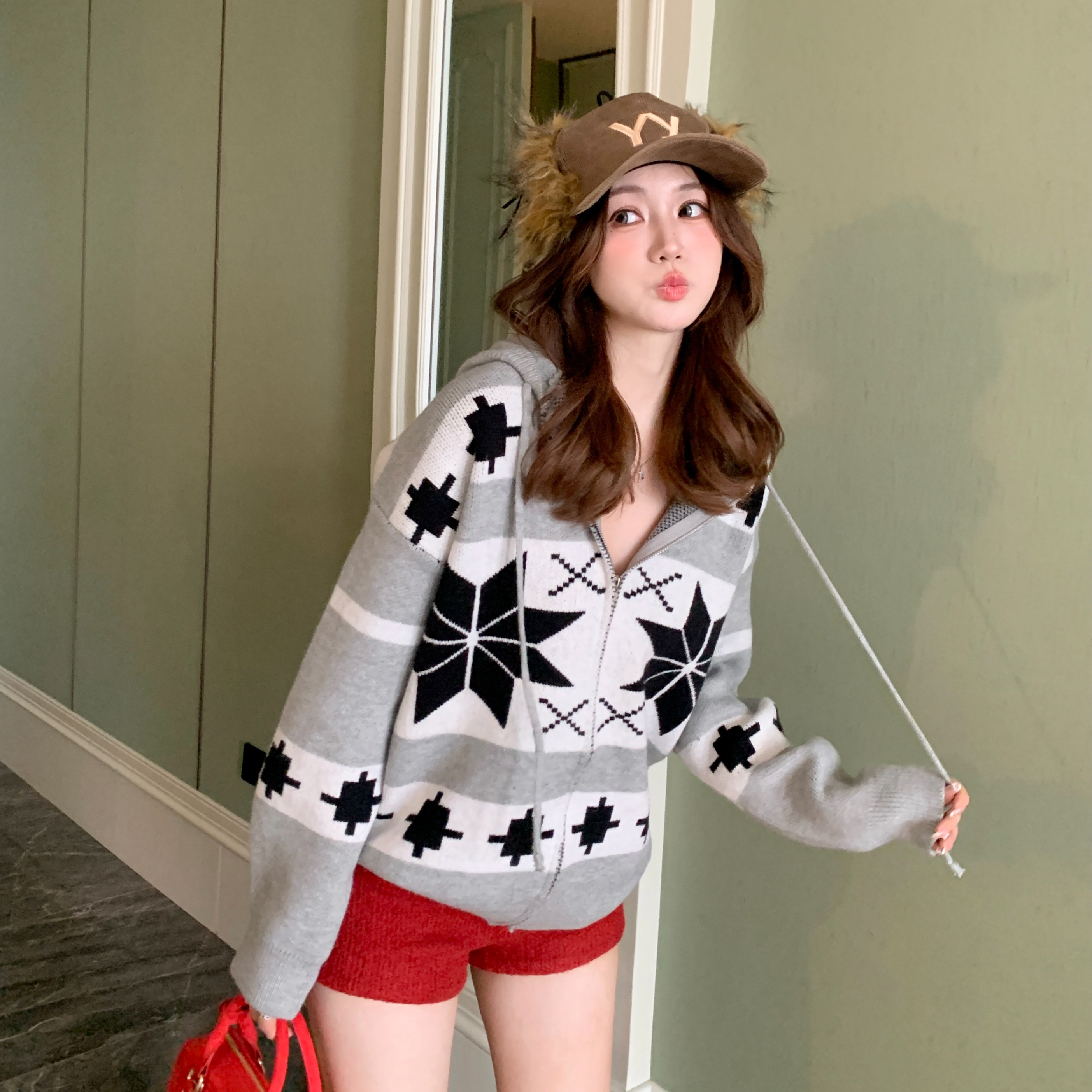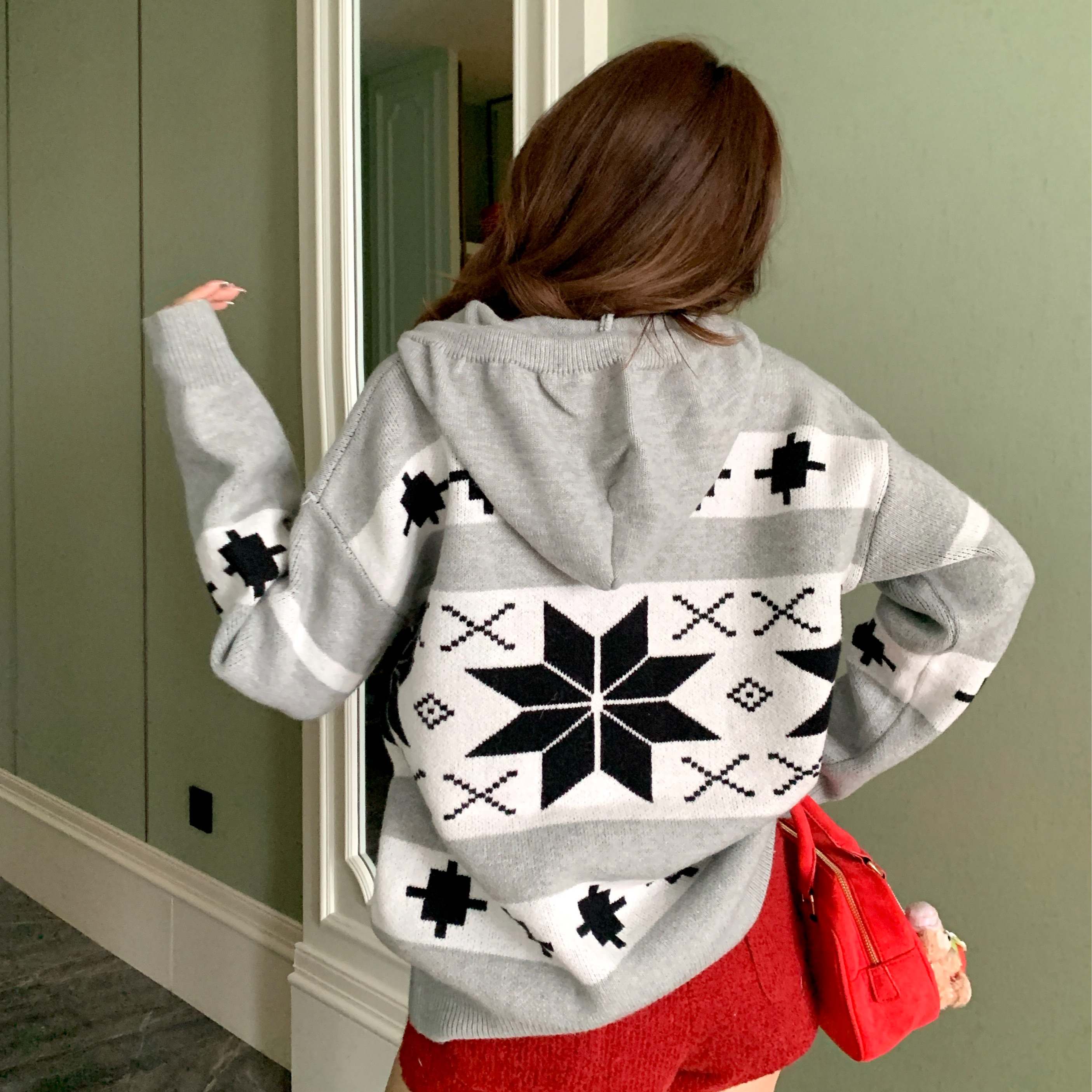 实拍 氛围感重工灰色费尔岛拉链连帽毛衣外套秋冬慵懒风宽松开衫