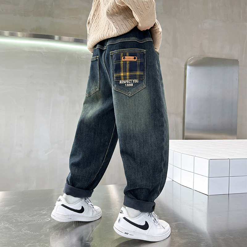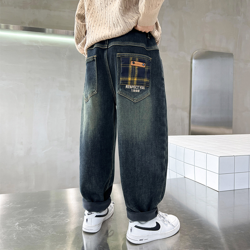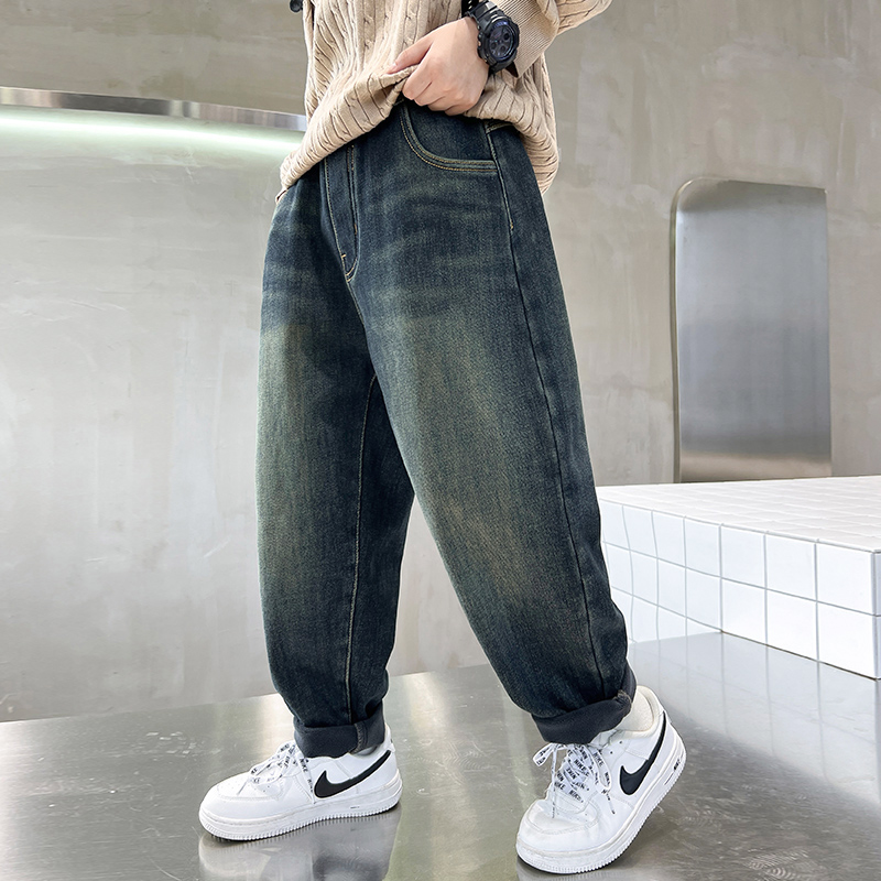 男童加绒裤子秋冬款2025新款洋气儿童休闲男孩中大童牛仔长裤秋装