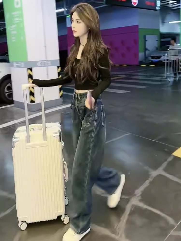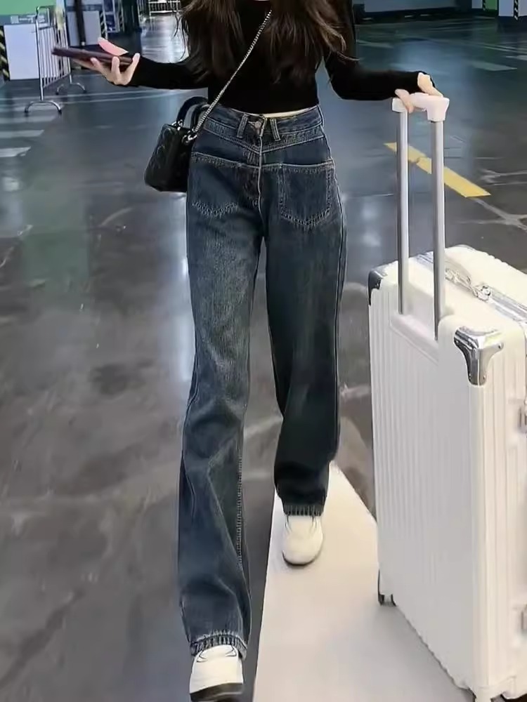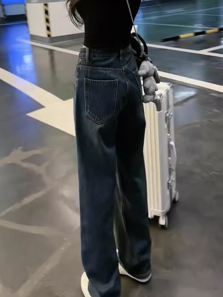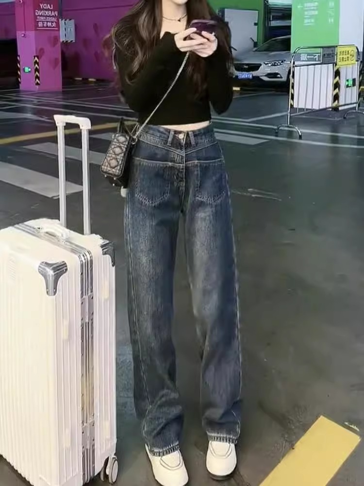 网红爆款2025年春秋新款百搭牛仔裤女高腰直筒阔腿小个子拖地长裤