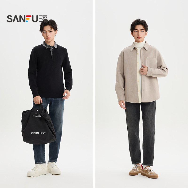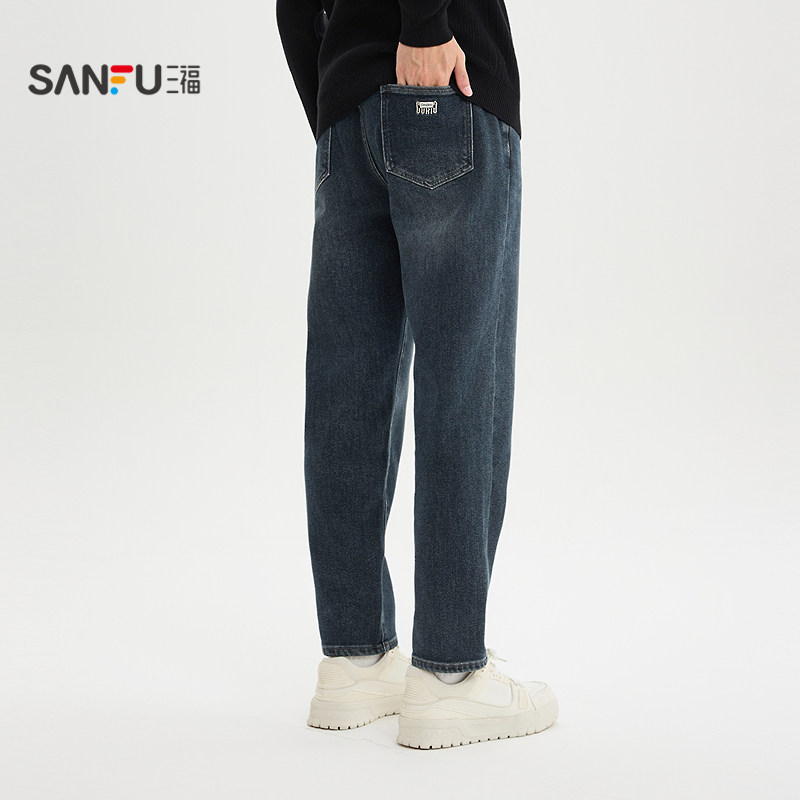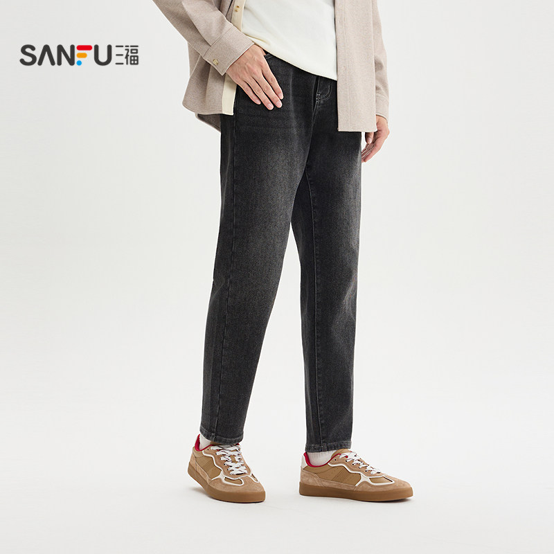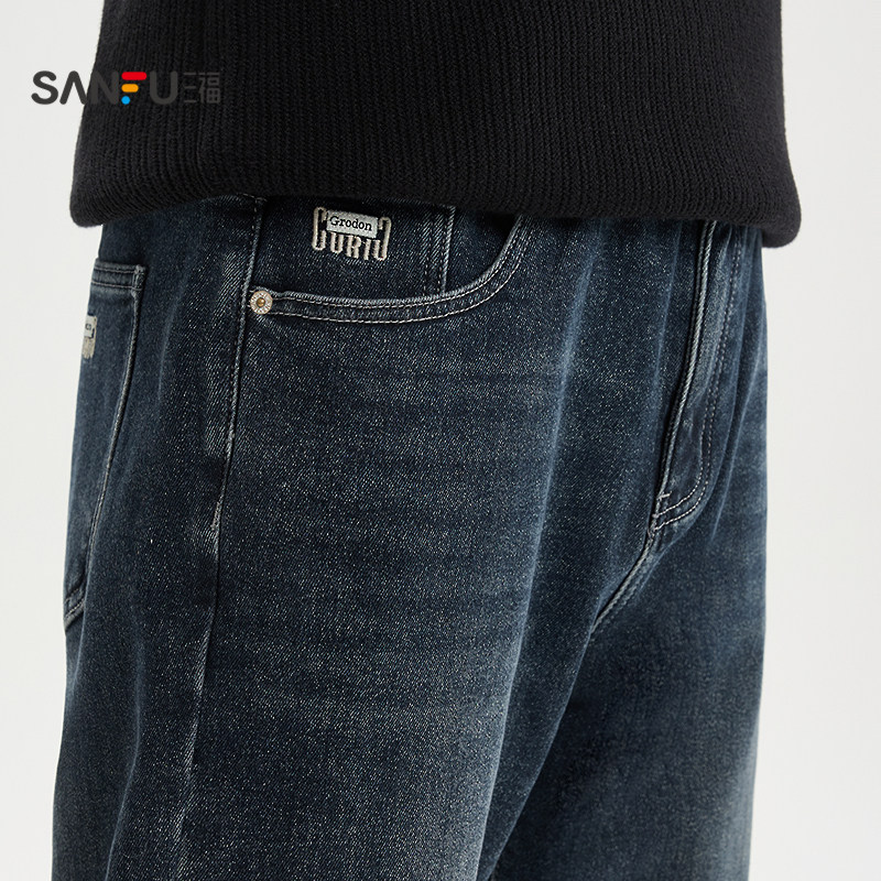 三福2025冬季男士经典洗水半松紧腰牛仔裤 合身小脚长裤511963