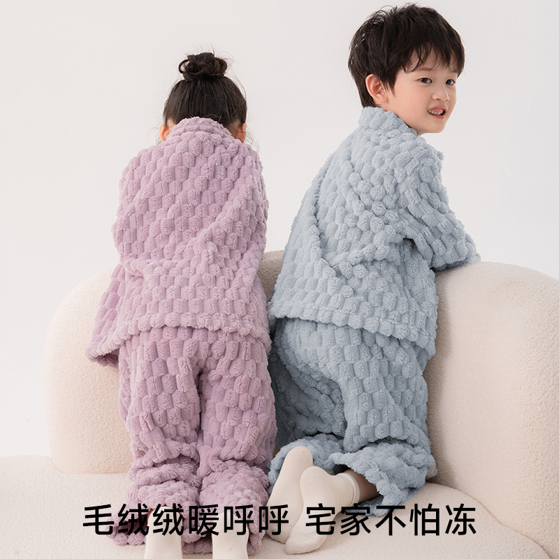 儿童珊瑚绒睡衣套装秋冬季男童女童加厚加绒双面颗粒绒开衫家居服