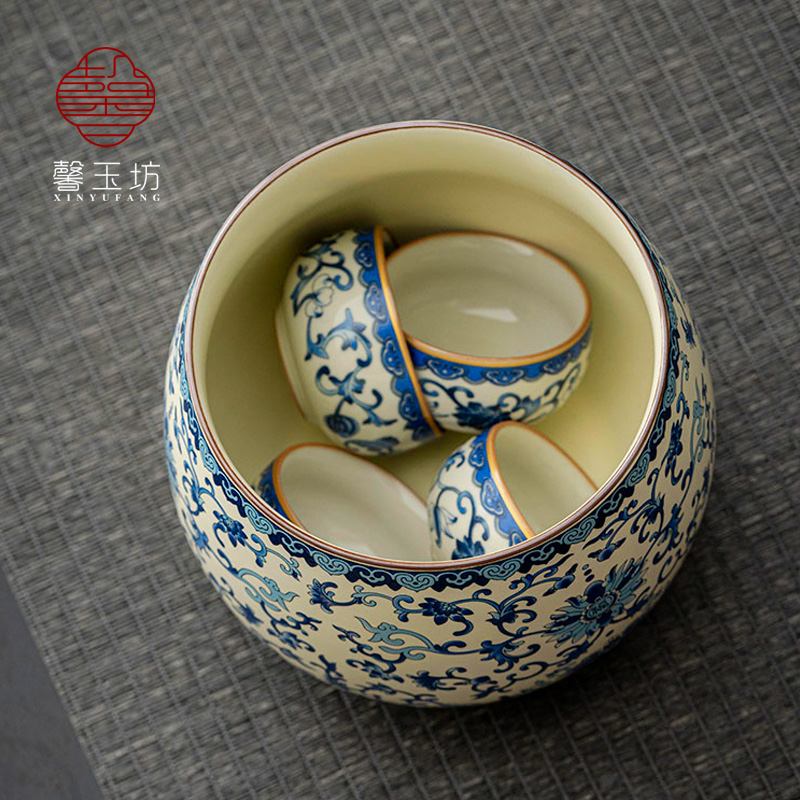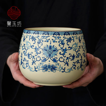 中式米黄汝窑青花茶洗大号废茶渣缸办公家用收纳茶杯茶盆杯洗水盂