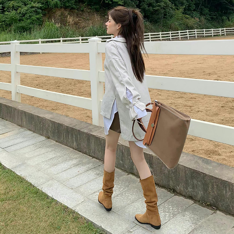 复古尖头粗跟西部牛仔长靴女中筒瘦瘦靴2022褶皱堆堆靴套筒骑士靴